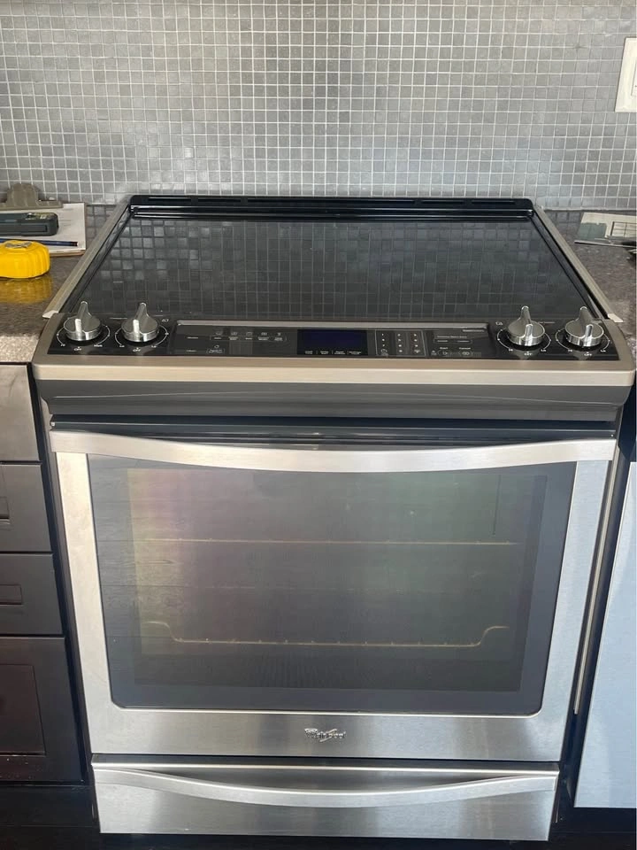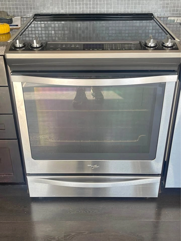 Whirlpool 30” slide-in electric range with large 6.4 cu.ft convection oven and self-cleaning feature. Stainless steel finish, smooth glass top, excellent working condition.