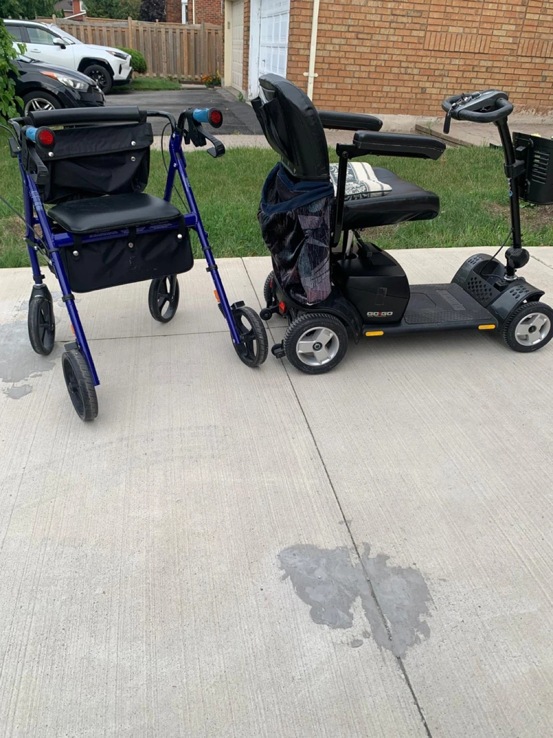 Selling an electric mobility scooter and a 4 wheel rolling walker. Both are in good condition and ready to help you get around! The scooter is black, new battery. The walker is blue. Feel free to message me if you're interested.