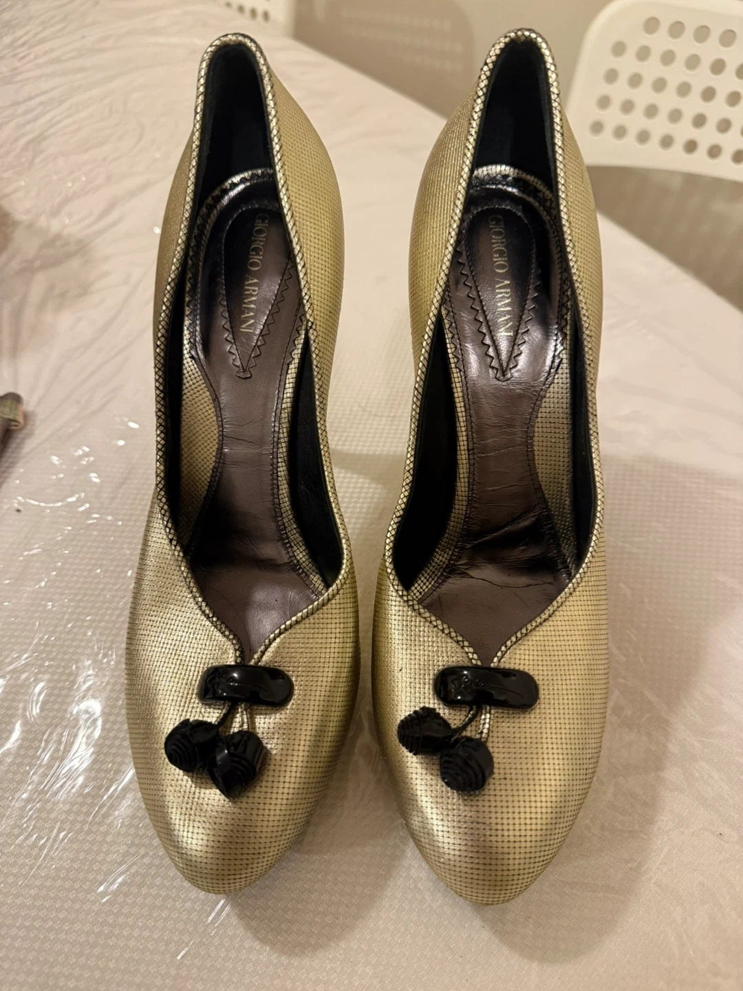 Selling a pair of Giorgio Armani gold heels. They feature a unique design with black accents. Perfect for adding a touch of elegance to your outfit!