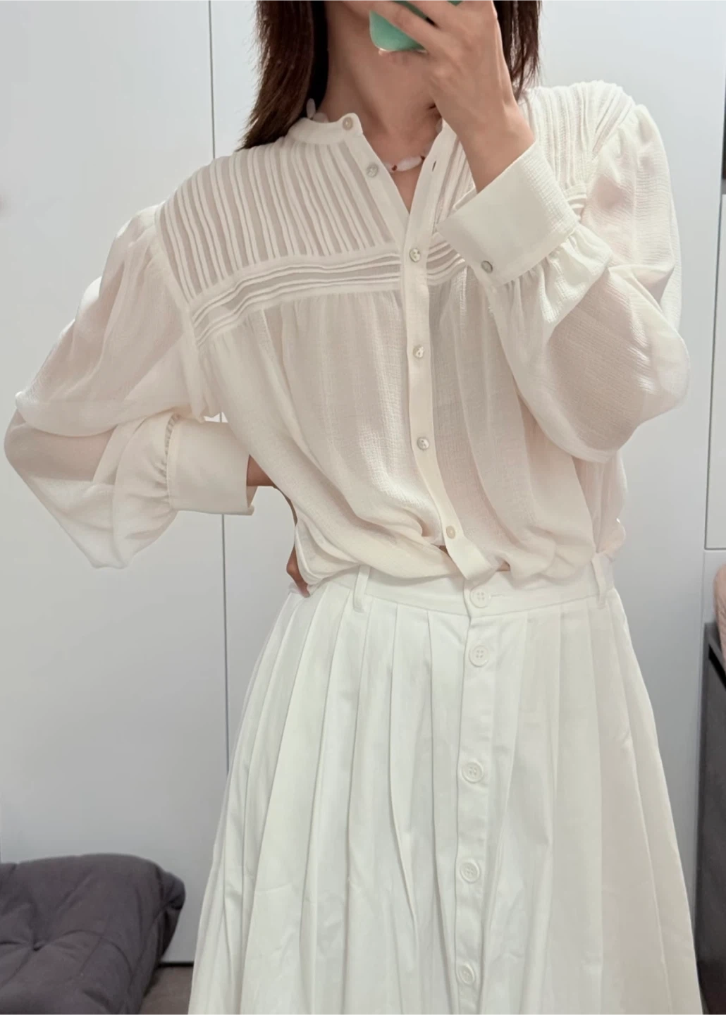 Selling a lovely cream-coloured pleated blouse from Zara! It's a size M and new with tag. The material is lightweight and for spring or summer. It features delicate pleating and button details, making it a stylish addition to any wardrobe.