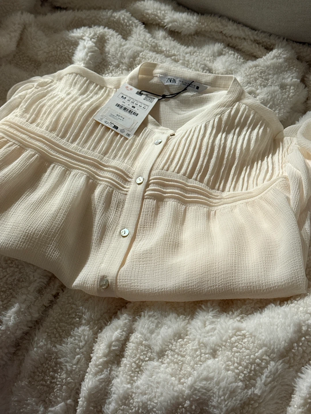 Selling a lovely cream-coloured pleated blouse from Zara! It's a size M and new with tag. The material is lightweight and for spring or summer. It features delicate pleating and button details, making it a stylish addition to any wardrobe.