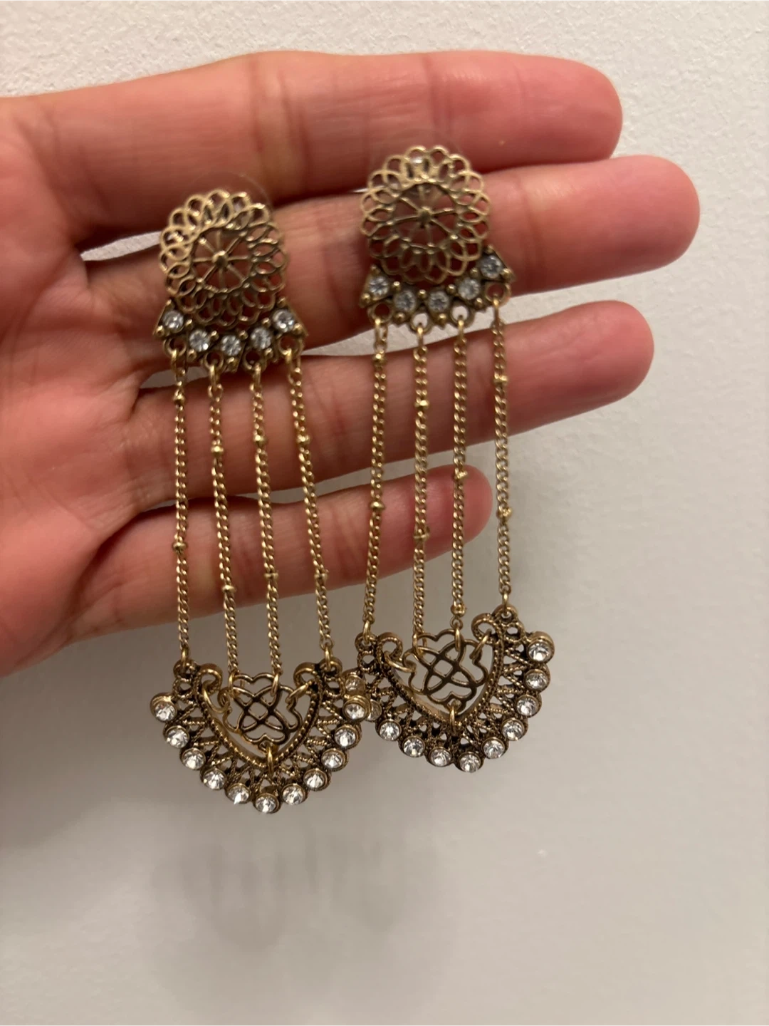 These are a pair of gold-toned dangle earrings. They feature a filigree design with small clear stones and hanging chains. They're in great condition and would make a lovely addition to any outfit!