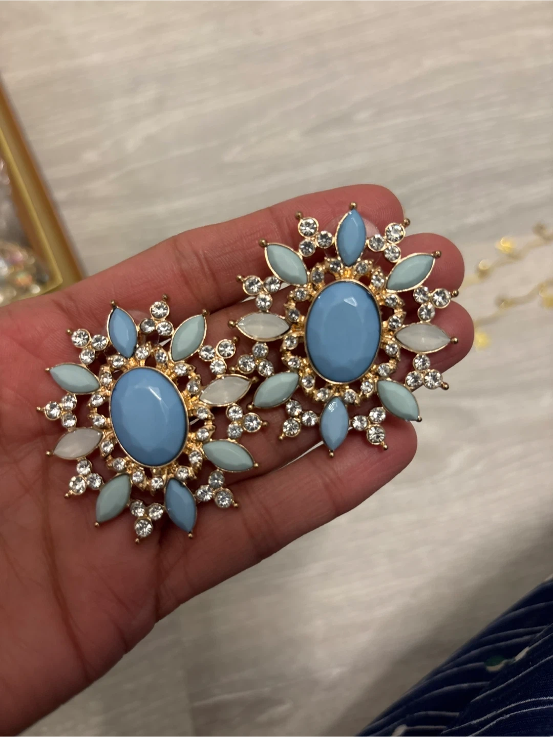 These earrings feature a beautiful floral design with light blue and white accents, set in a gold-tone metal. They're perfect for adding a touch of elegance to any outfit!