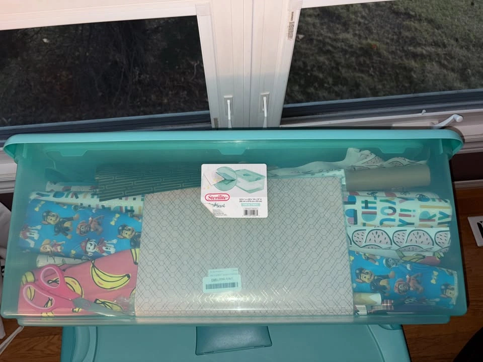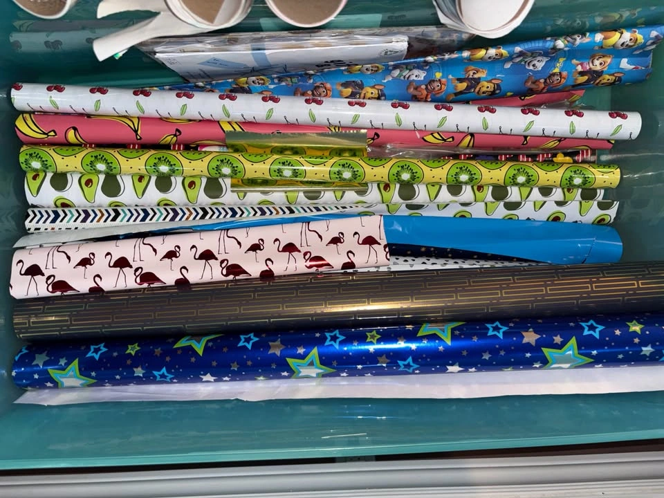 100L tote full of misc. gift wrap for general special occasions, birthdays, kids, adults etc. Asking $25 for all - some full rolls, some partial rolls.
