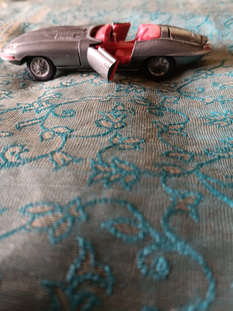 Selling a vintage Tekno Jaguar E-Type toy car! It has a grey exterior with a red interior. A charming piece for collectors or anyone who appreciates classic toy cars