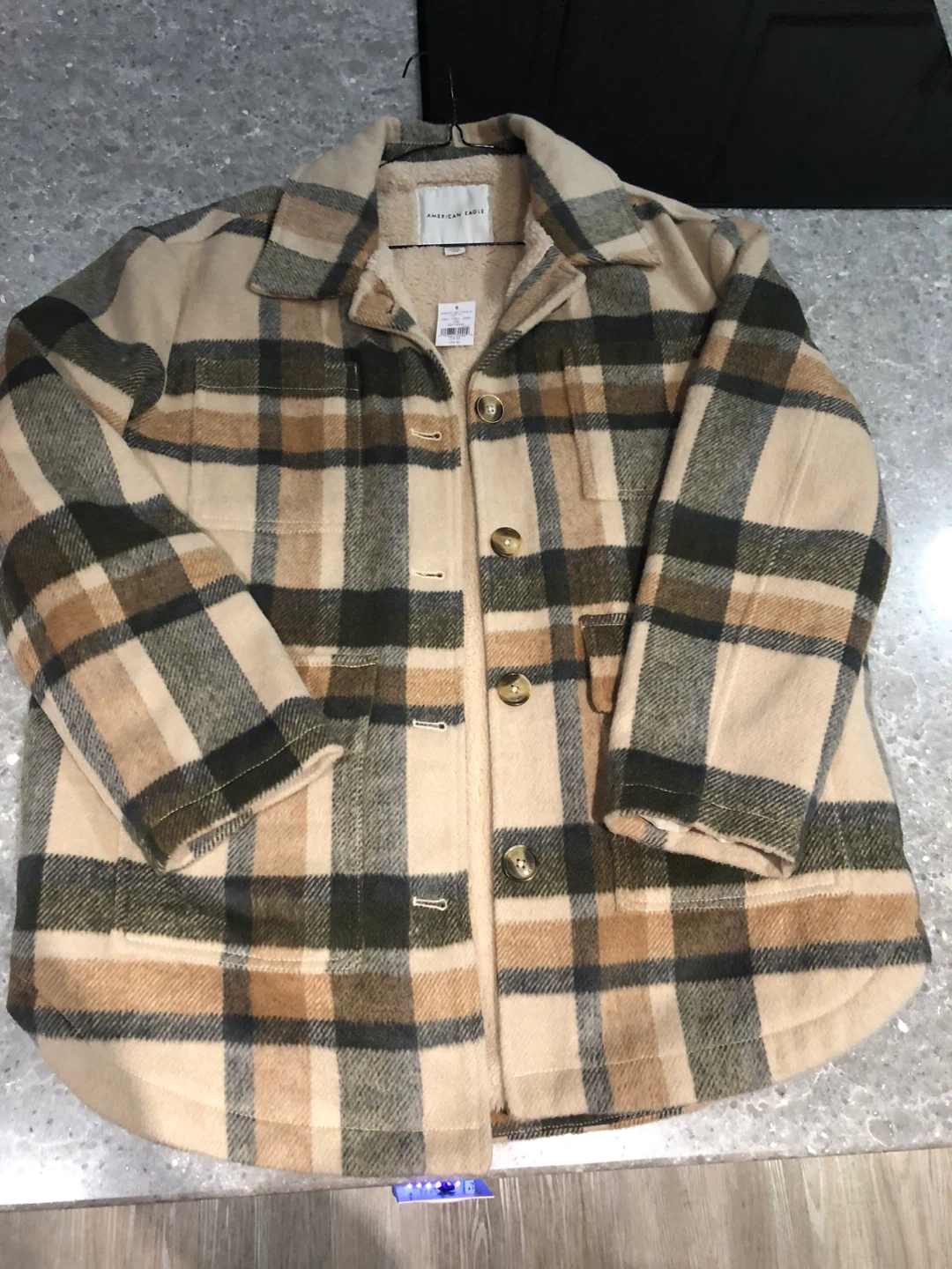 Cozy American Eagle shacket with a classic plaid pattern and a warm sherpa lining. It's a size M and in new condition tags attached. Perfect for layering this fall!