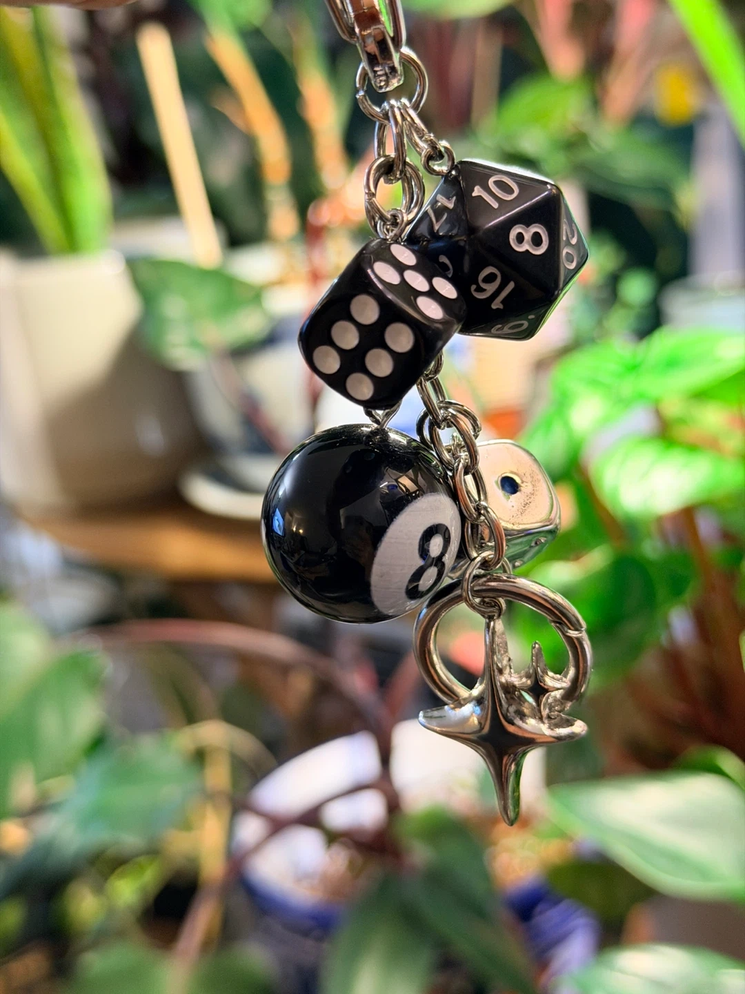 Here's a fun keychain with a dice and 8-ball theme! It features a variety of dice and an 8-ball charm, all connected with a sturdy chain and clasp. It's perfect for adding a bit of personality to your keys or backpack