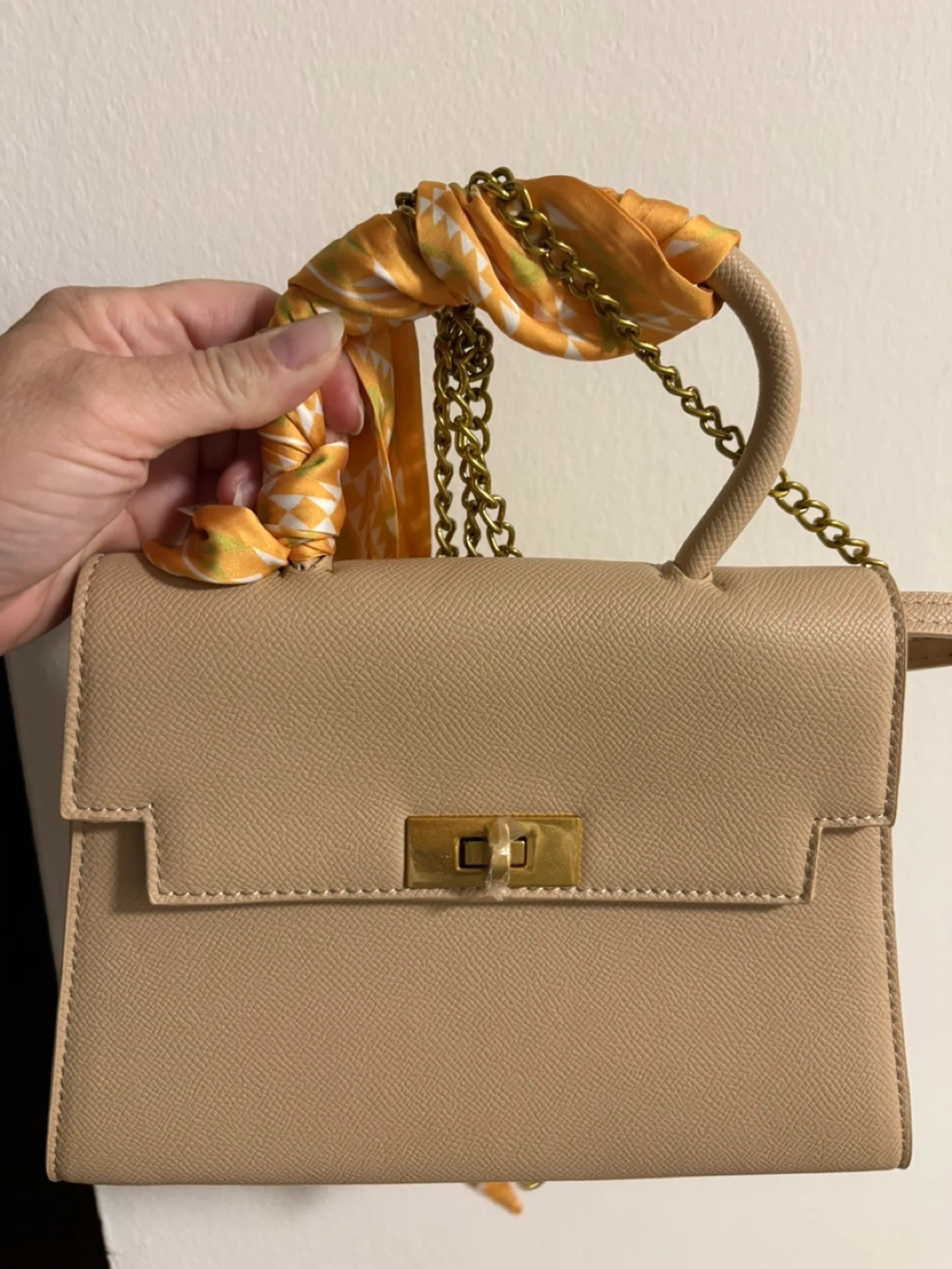 56A cute beige handbag with a unique scarf detail on the handle! It features a gold-tone clasp and chain. Perfect for adding a touch of style to any outfit