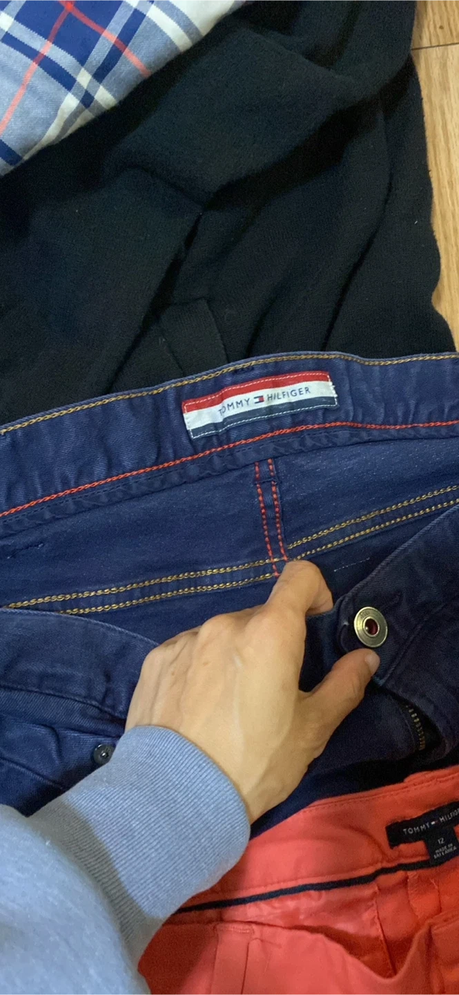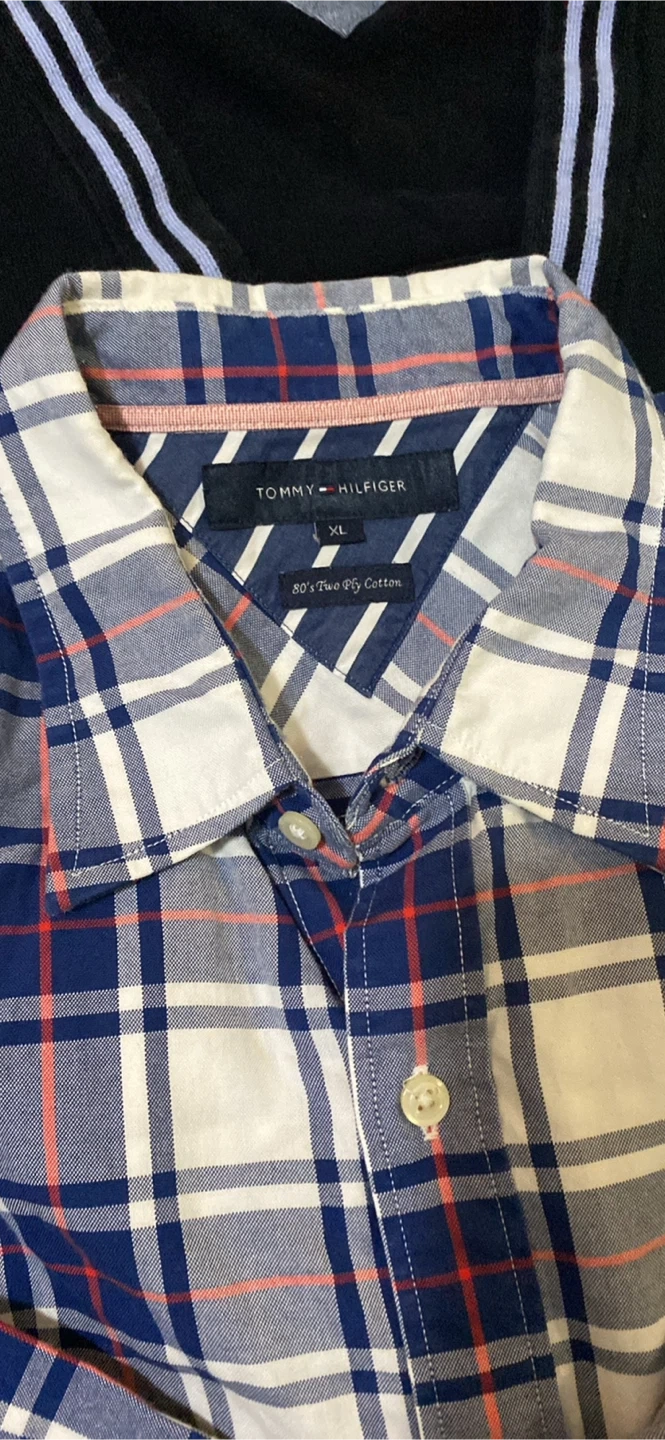 90Selling a bundle of Tommy Hilfiger clothing! Includes a blue plaid shirt (XL), a black sweater, a pair of 38x32 jeans, and size 12 pants