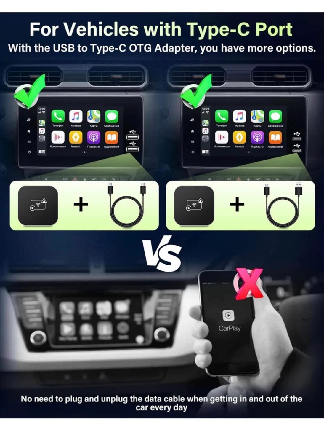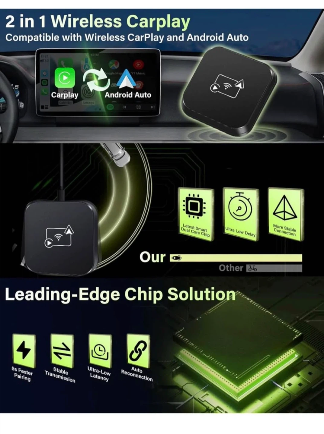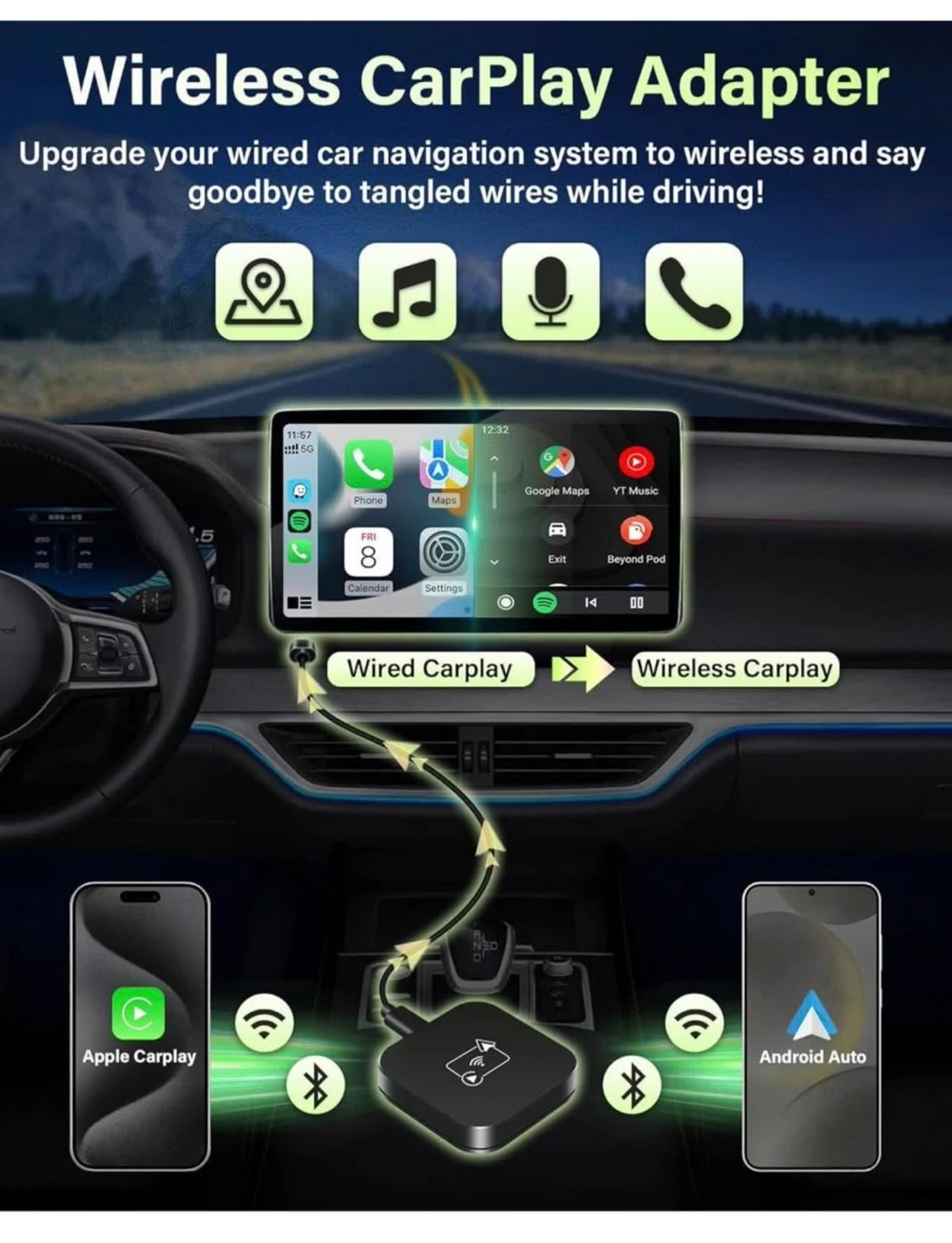 Upgrade your car's wired CarPlay system to wireless with this adapter! It's compatible with both wireless CarPlay and Android Auto. Enjoy a seamless integration with your car's original controls and say goodbye to tangled wires while driving. It also supports all functions of the original CarPlay, including voice assistant, touch screen and steering wheel control