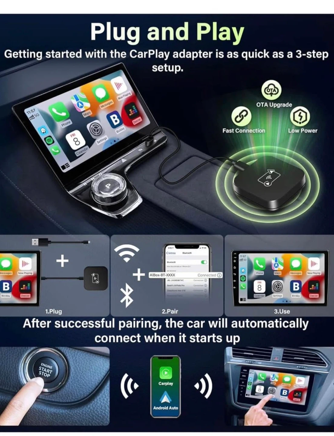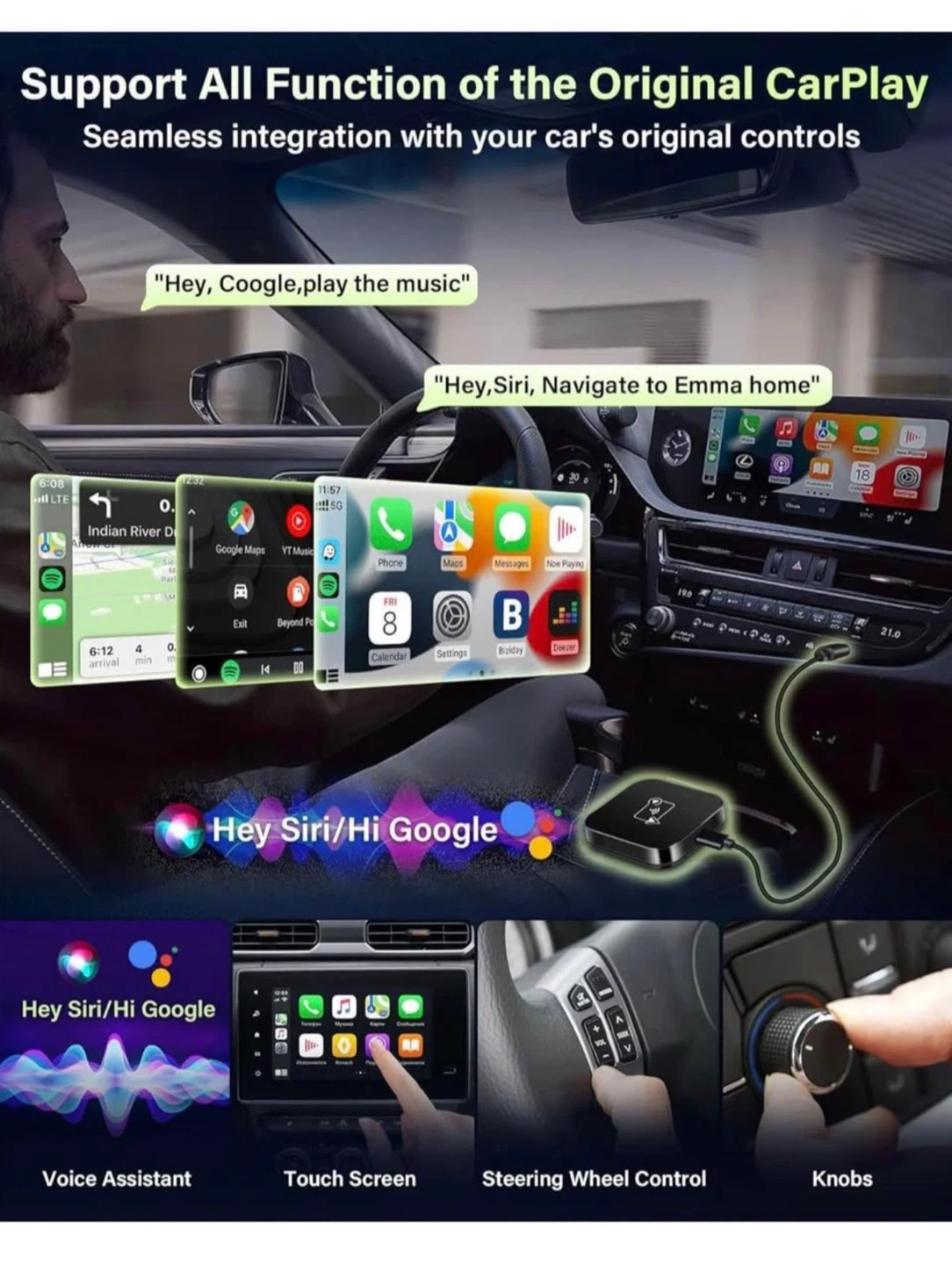 Upgrade your car's wired CarPlay system to wireless with this adapter! It's compatible with both wireless CarPlay and Android Auto. Enjoy a seamless integration with your car's original controls and say goodbye to tangled wires while driving. It also supports all functions of the original CarPlay, including voice assistant, touch screen and steering wheel control