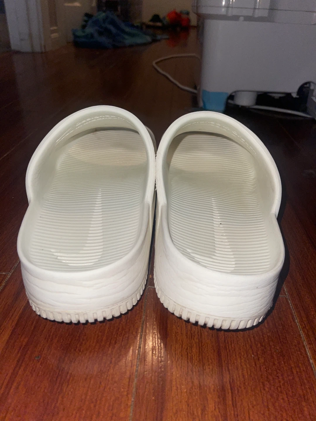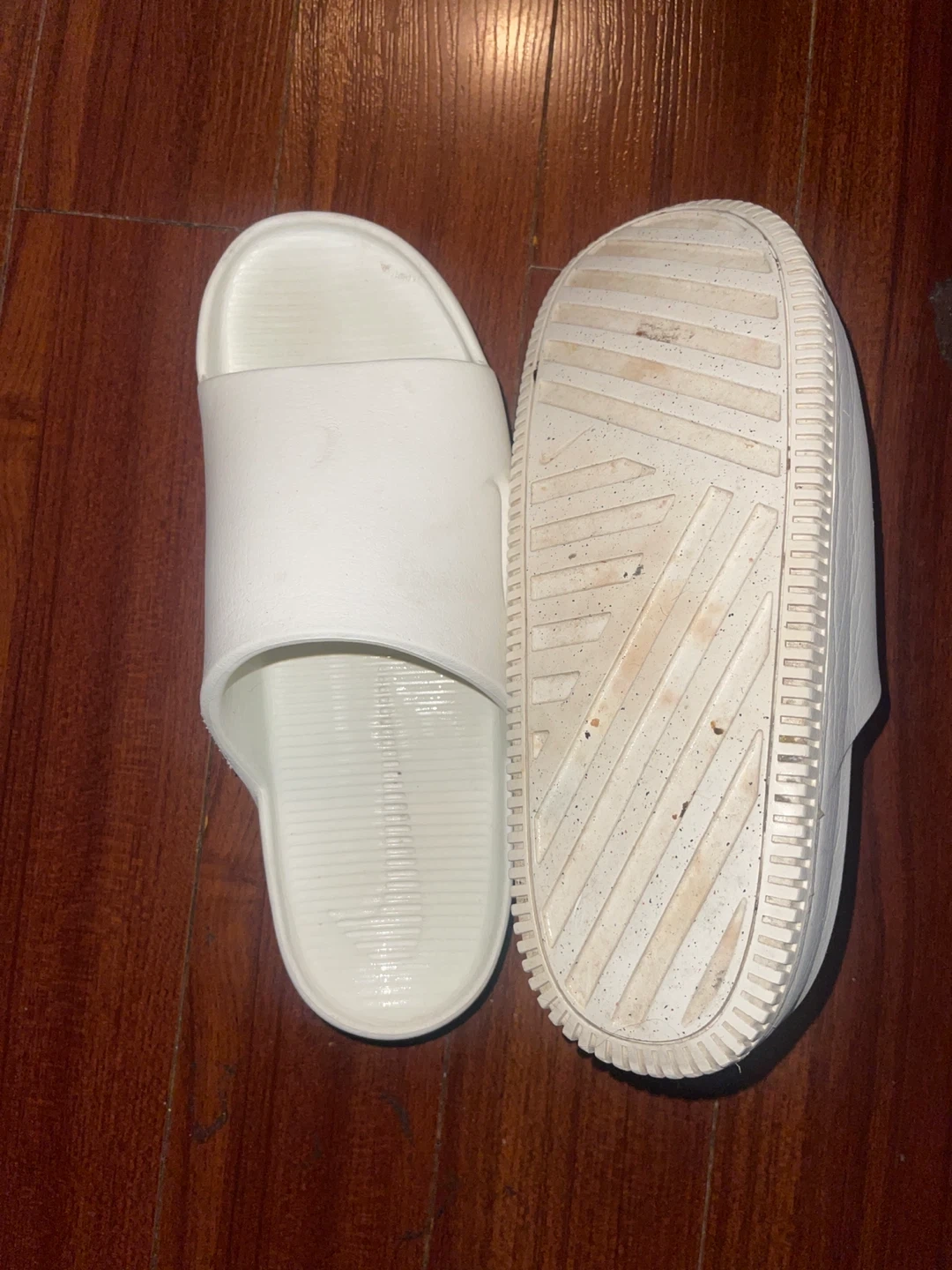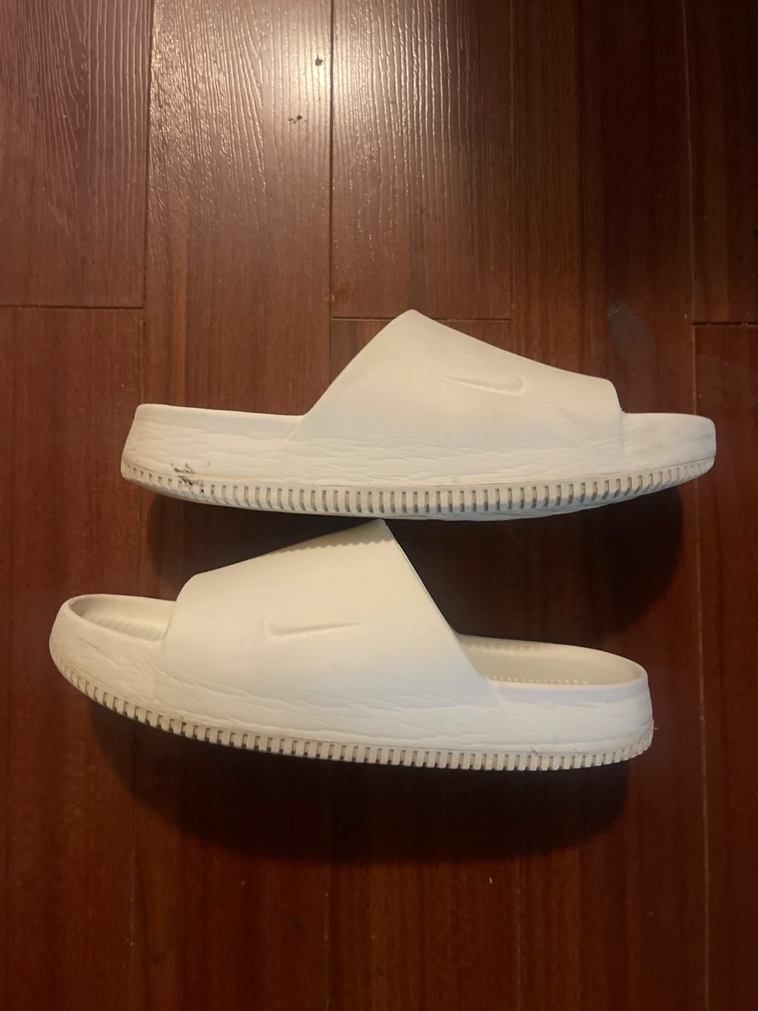 76White Nike Calm Slides - Size 12 These White Nike Calm Slides (Size 12) have served me well over the past two months. Super comfortable, lightweight, and perfect for everyday wear — whether you're lounging at home, heading to the gym, or running errands. Minimal signs of wear and still in great condition. Well worth it when I got them, and they’ve got plenty of life left.