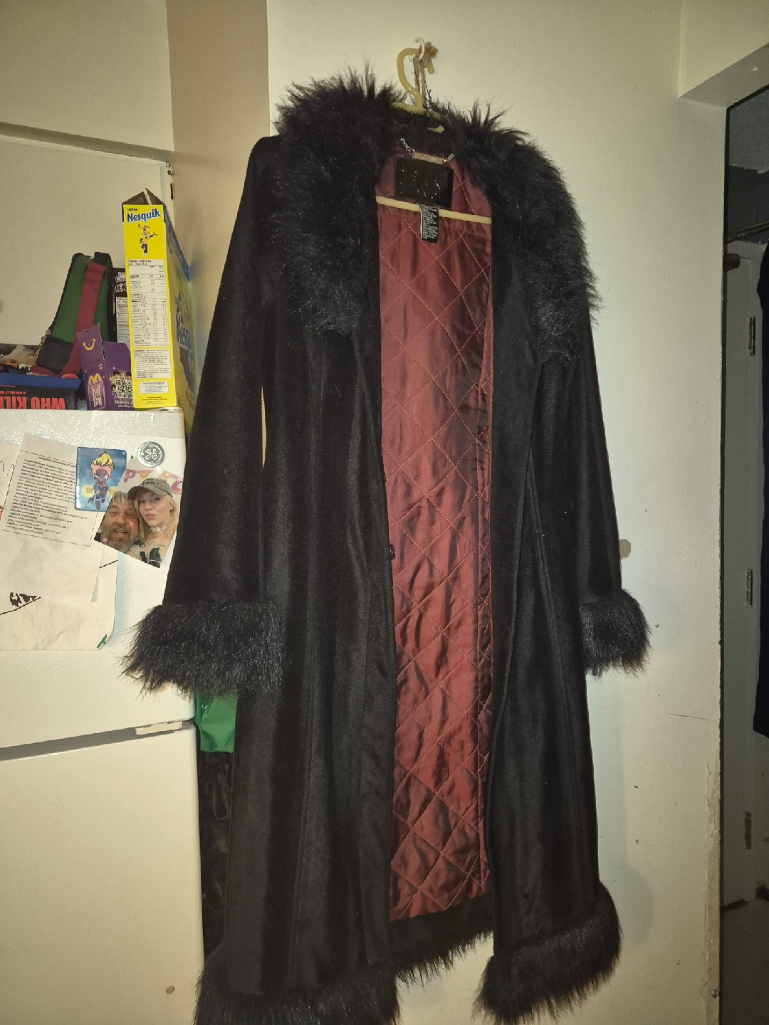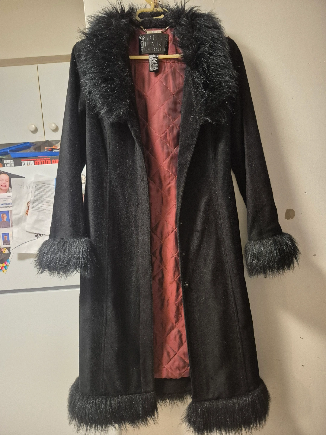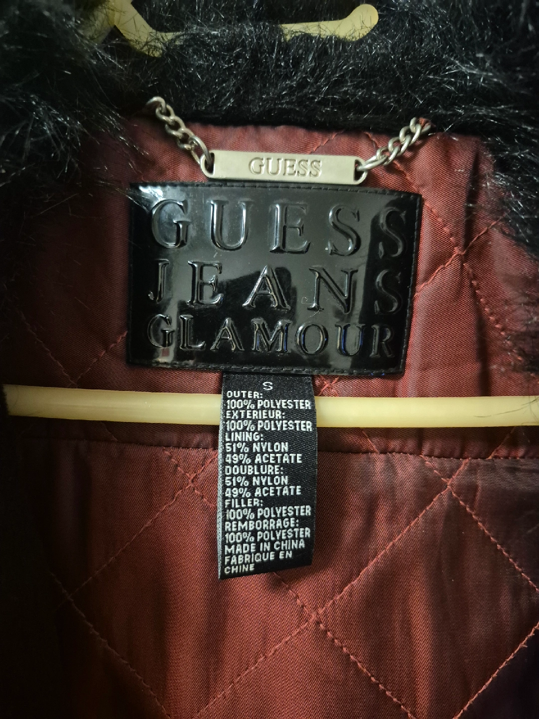 60Selling a Guess Jeans Glamour coat in size small! It's a stylish black coat with faux fur trim, perfect for adding a touch of glamour to your wardrobe. The outer material is 100% polyester, and the lining is a blend of nylon and acetate. It's in great condition BESIDES MISSING ONE BUTTON ! can be fixed