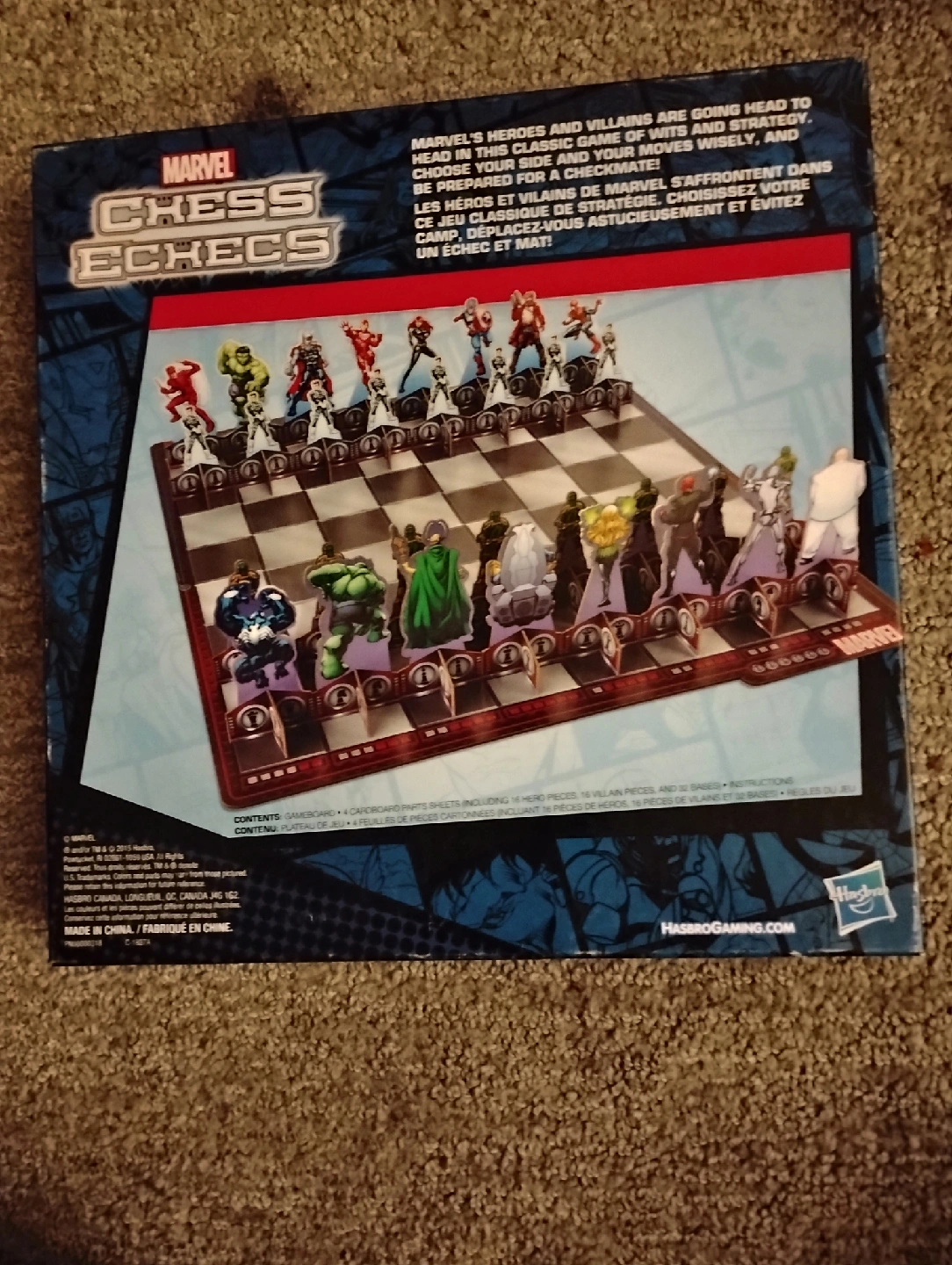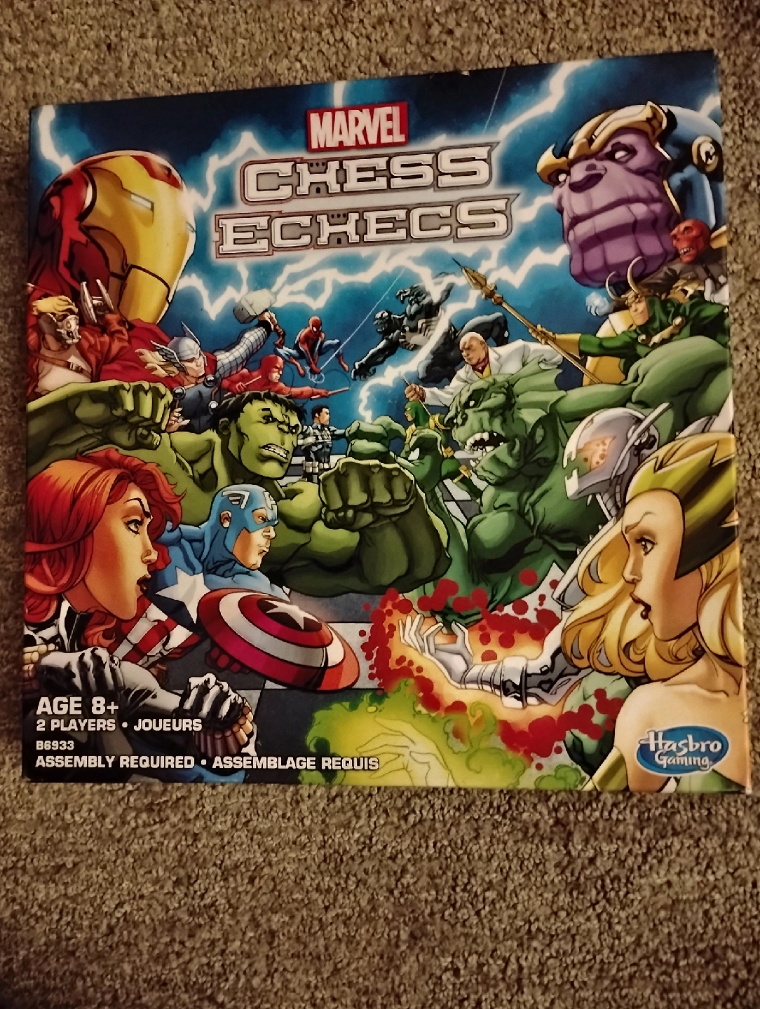 Selling a Marvel Chess set for ages 8+. It's a classic game with a superhero twist! The box includes cardboard parts and hero/villain pieces. Assembly is required, so it's a fun project to put together before playing. Great for Marvel fans and chess enthusiasts alike