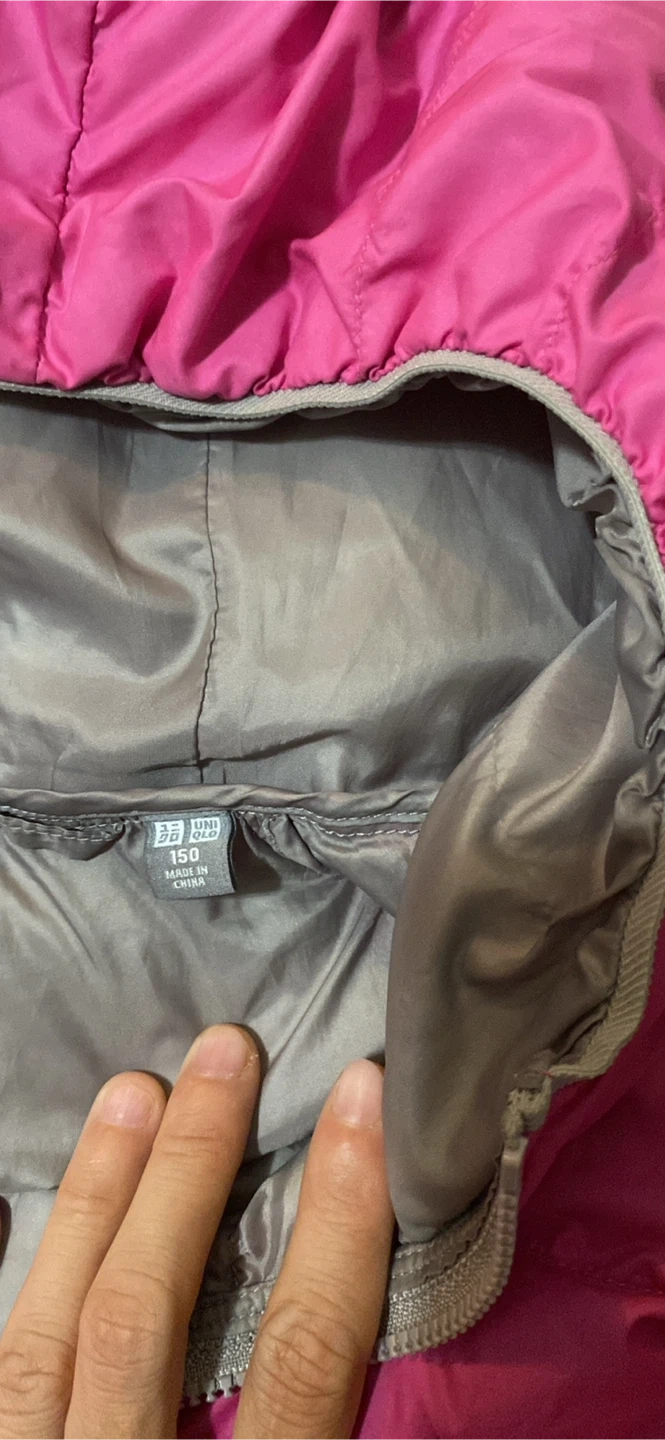 85Selling a Uniqlo puffer jacket in a vibrant pink! It's in great condition and perfect for keeping warm. The size is 150.