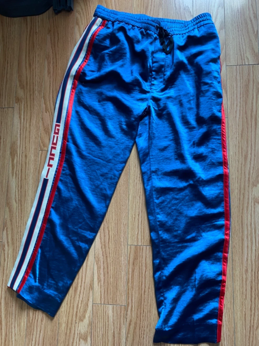 65Selling a pair of Gucci track pants in a striking blue colour! They are a size M and feature the iconic Gucci stripe design down the side. Perfect for adding a touch of luxury to your casual wear