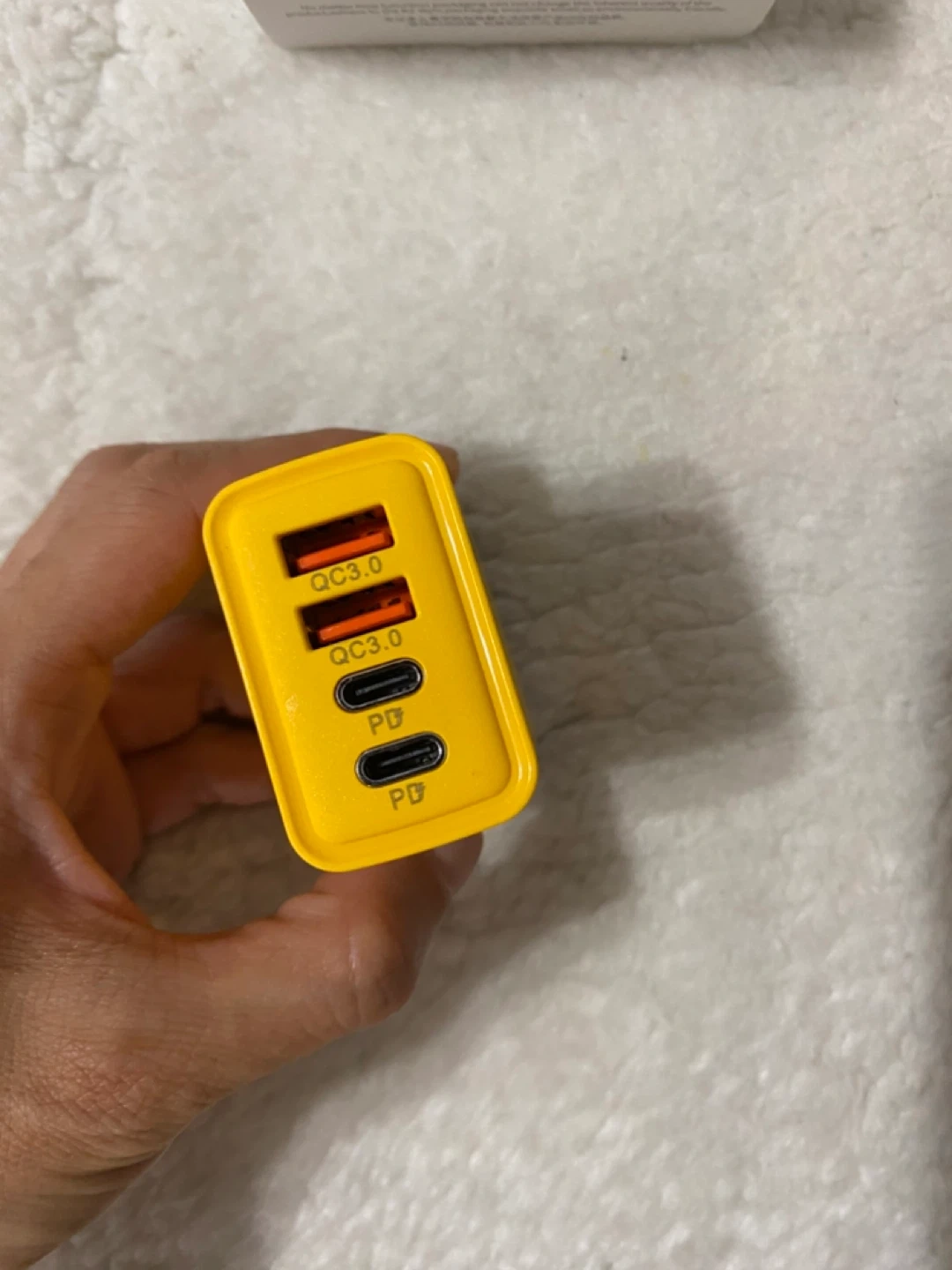 65Selling a Super Fasr 120W 4-Port Fast Charger in yellow! It has 4 ports for charging your devices quickly. The charger supports USB-C and QC3.0.