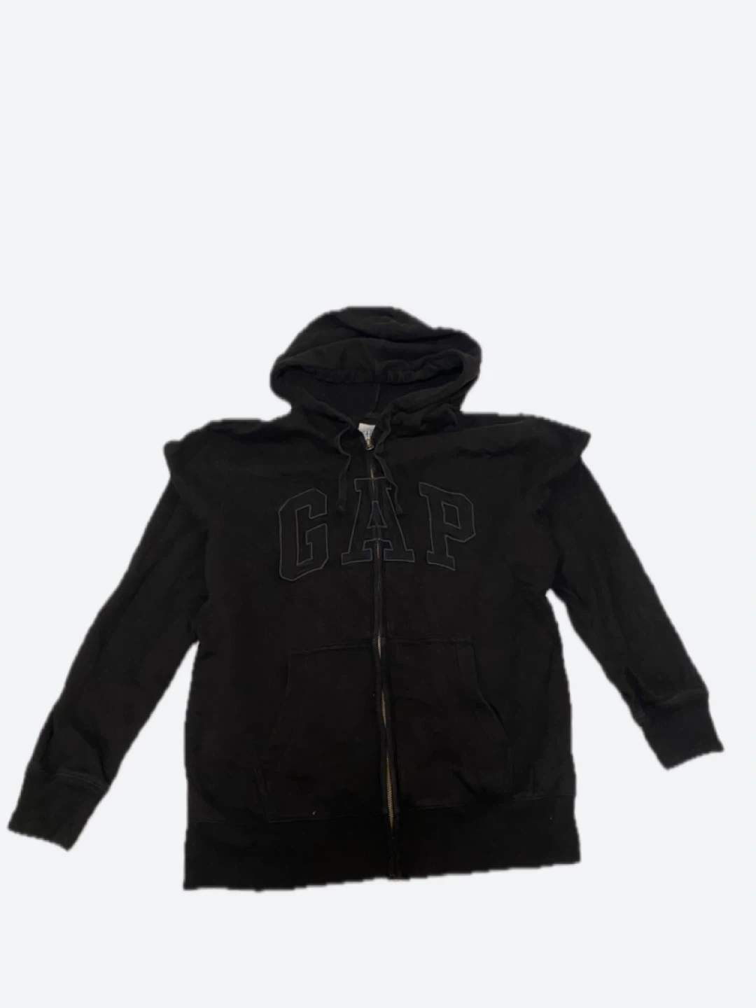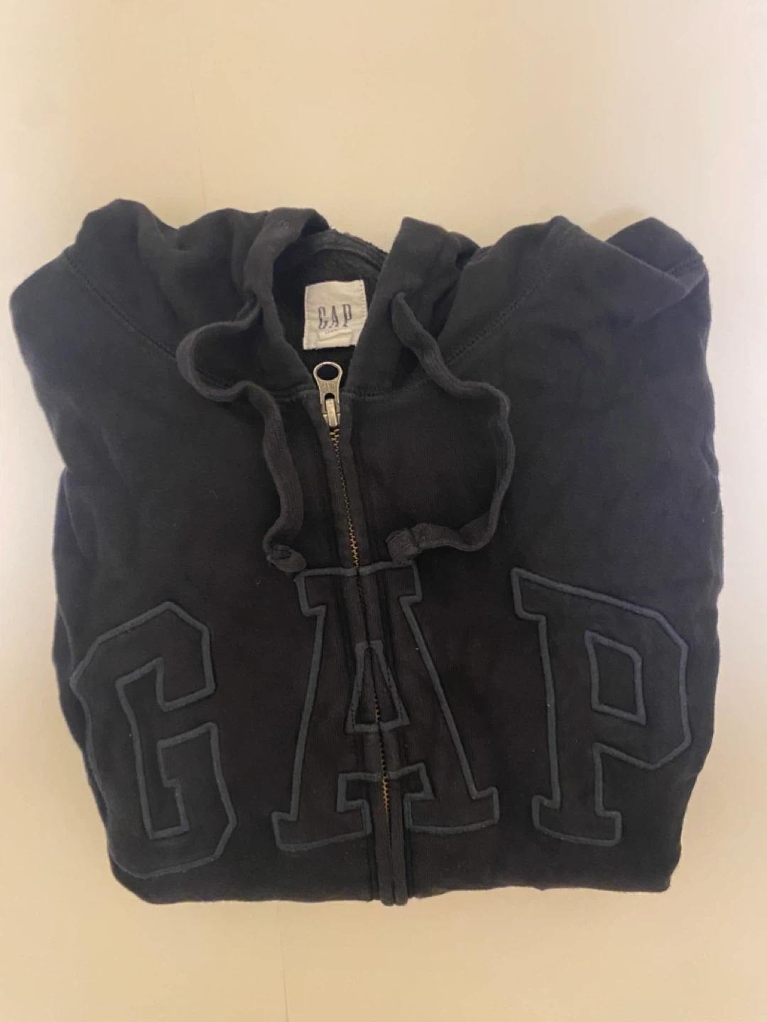 Selling a black GAP full zip hoodie! It’s in very used/washed condition and perfect for layering or wearing on its own. It features the classic GAP logo on the front and a comfortable fit.