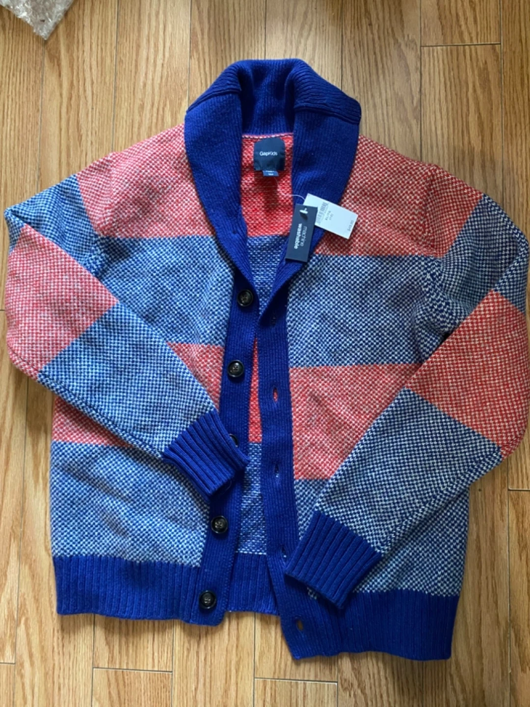 85This Gap Kids cardigan is brand new with tags! It's a size XL (12) and features a stylish blue, red, and white pattern. It's also machine washable, making it easy to care for. Originally bought for $49.95!
