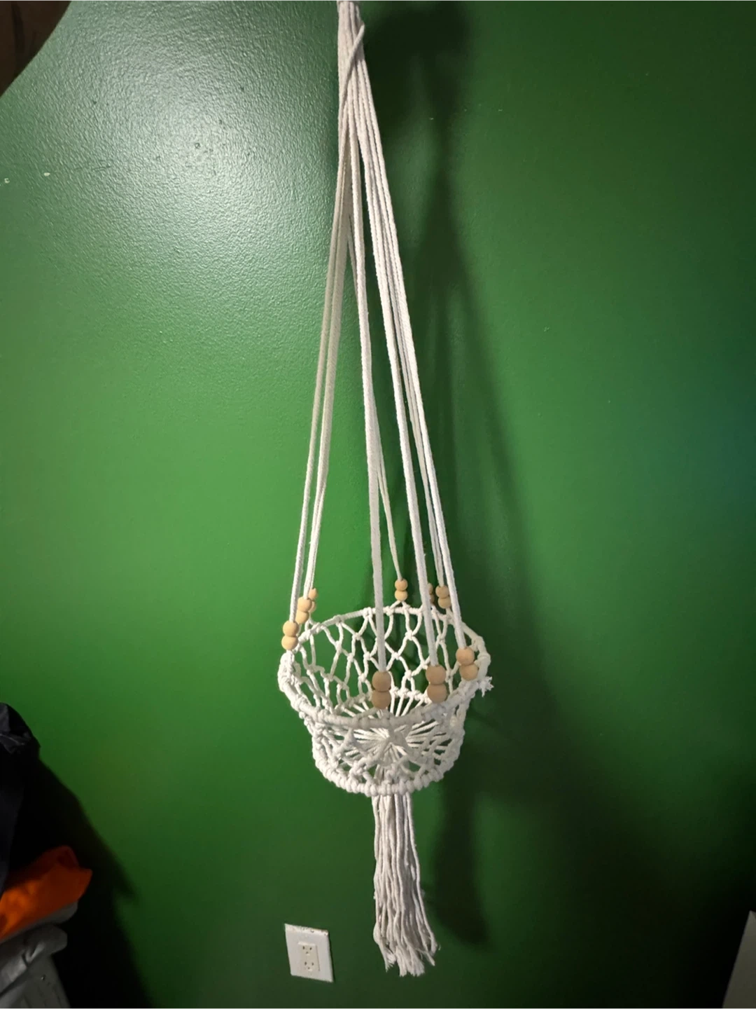 Here's a cute macrame plant hanger! It's perfect for adding a touch of boho style to your home. It's in great condition and ready for a new plant friend