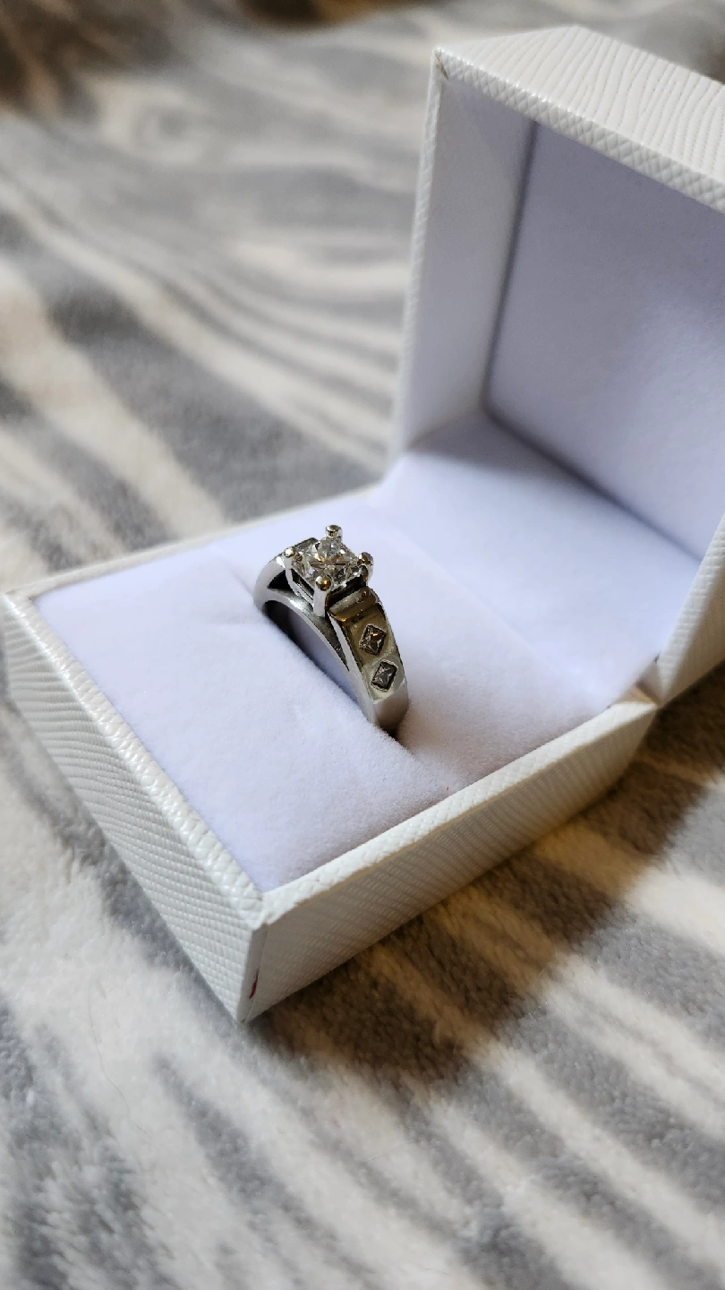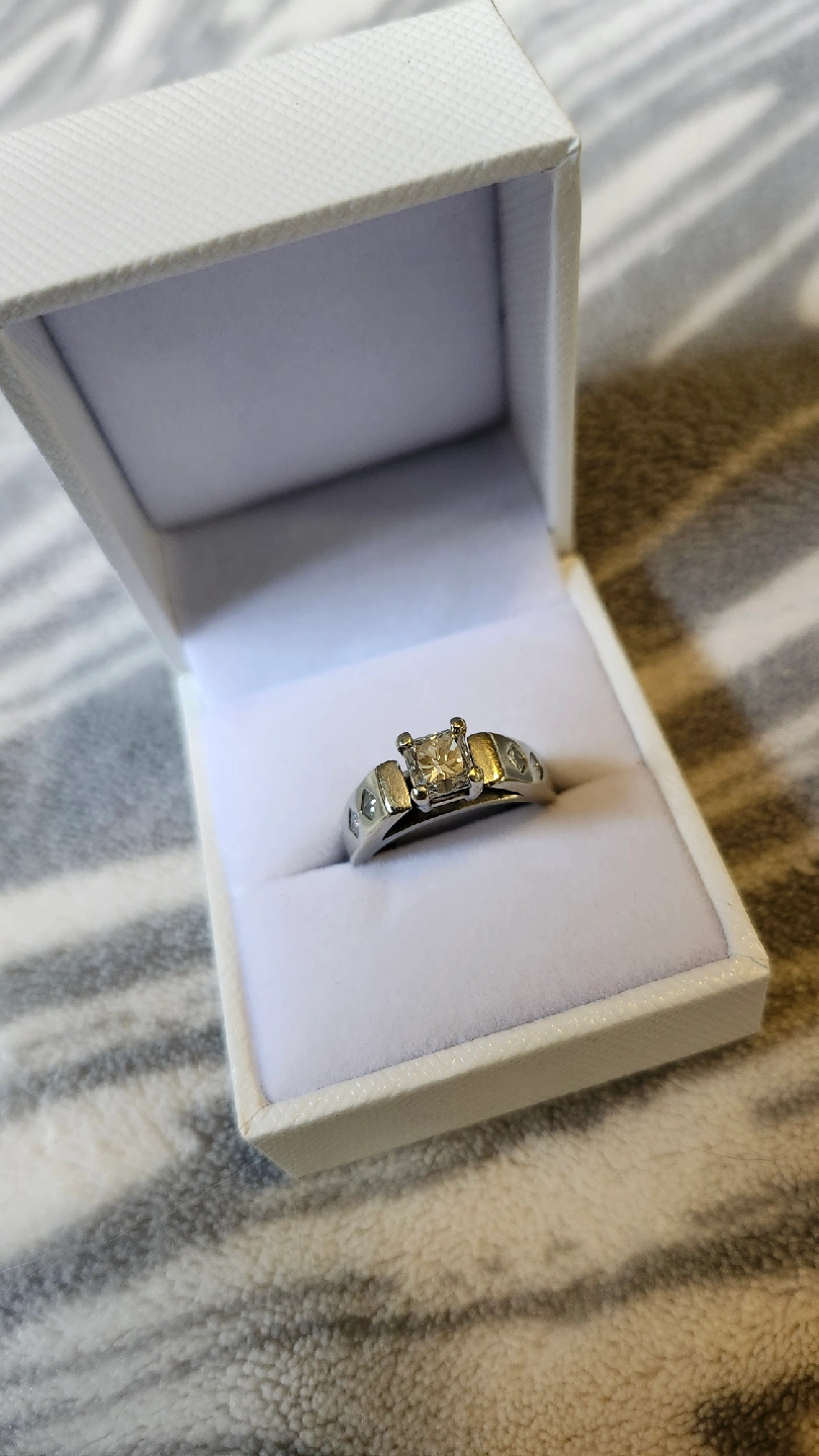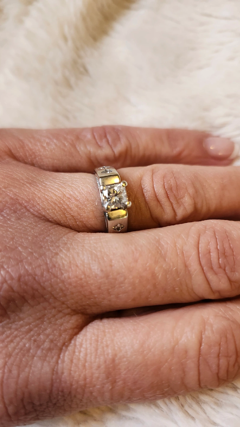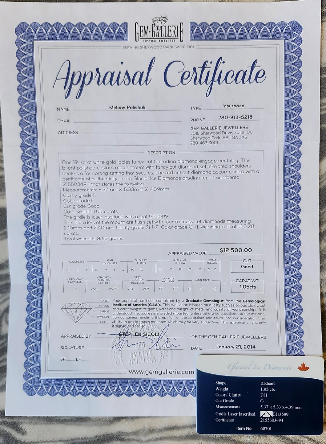 Selling a beautiful Gem Gallerie custom-made Canadian diamond engagement ring. It's crafted from 19 Karat white gold and features a fancy cut Canadian diamond, accompanied by a certificate of authenticity and a Glacial Ice Diamonds grading report. The shoulders of the ring are adorned with four princess cut diamonds. The total weight is 8.60 grams. Originally appraised at $12,500.00!
