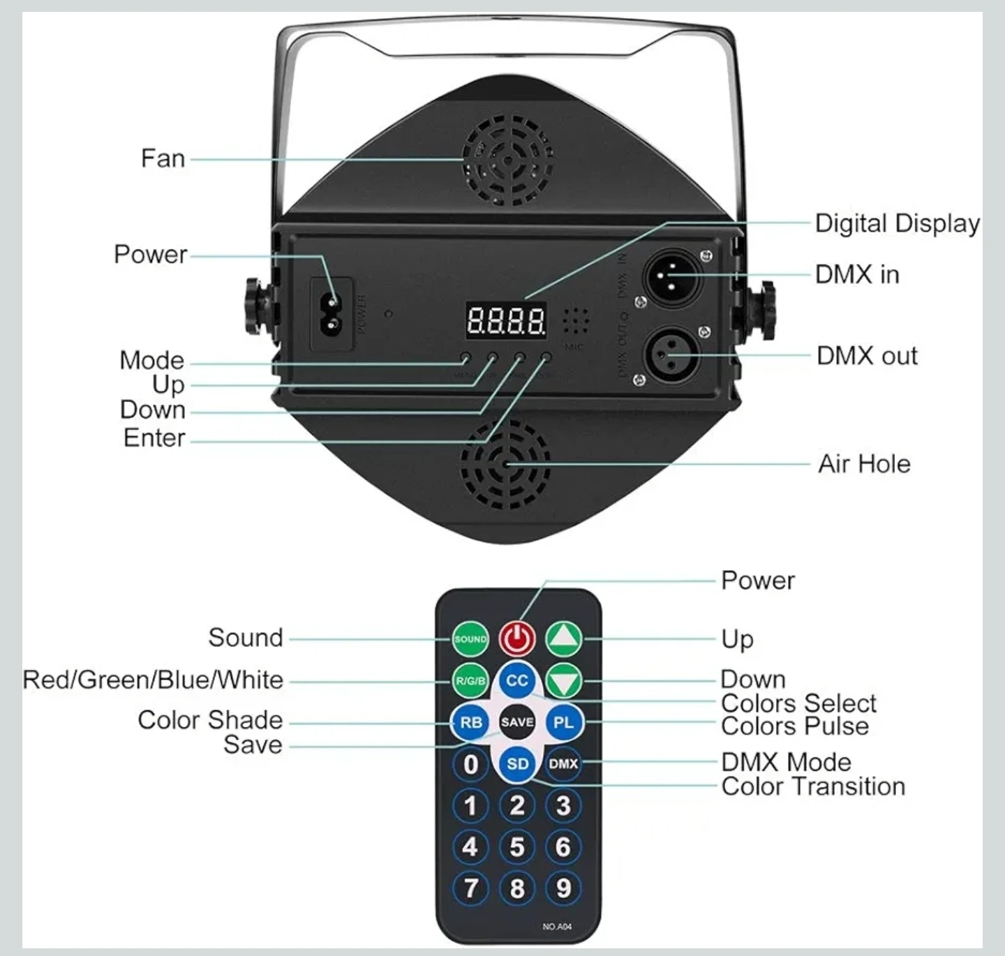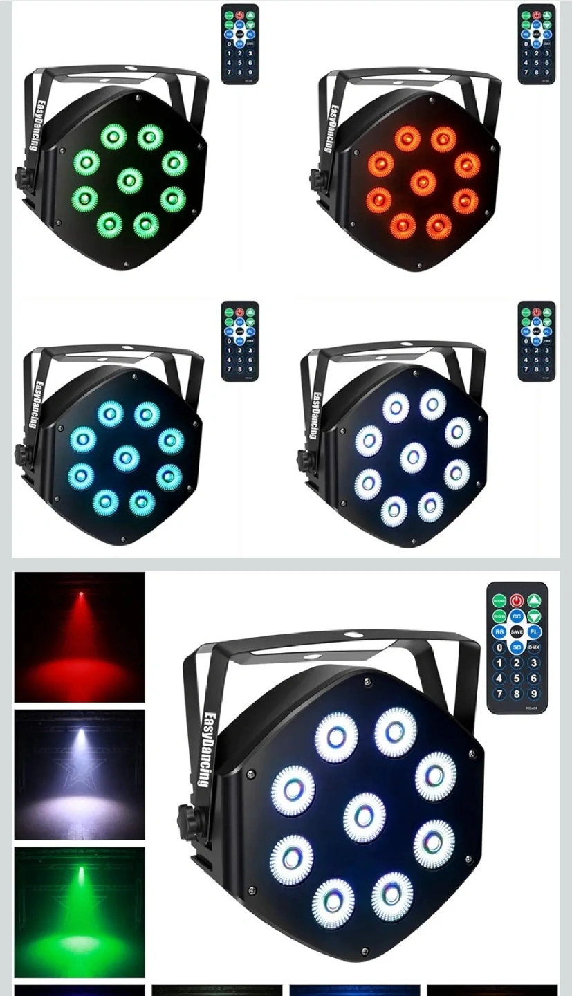65EasyDancing LED PAR Light with Remote. It has sound, red/green/blue/white colour options with colour shade save. It comes with a remote control.