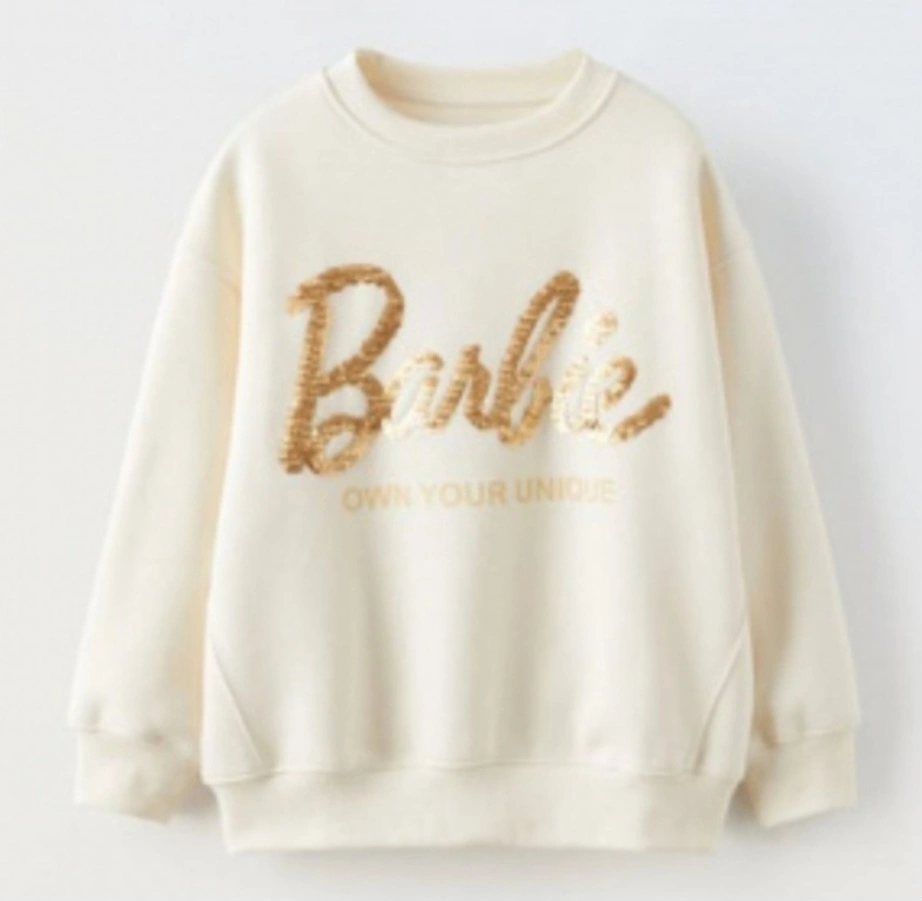 Cute cream-coloured sweatshirt with a sparkly 'Barbie' logo. 'Own your unique' is written underneath. Perfect for any Barbie fan! Brand new never worn. From Zara store