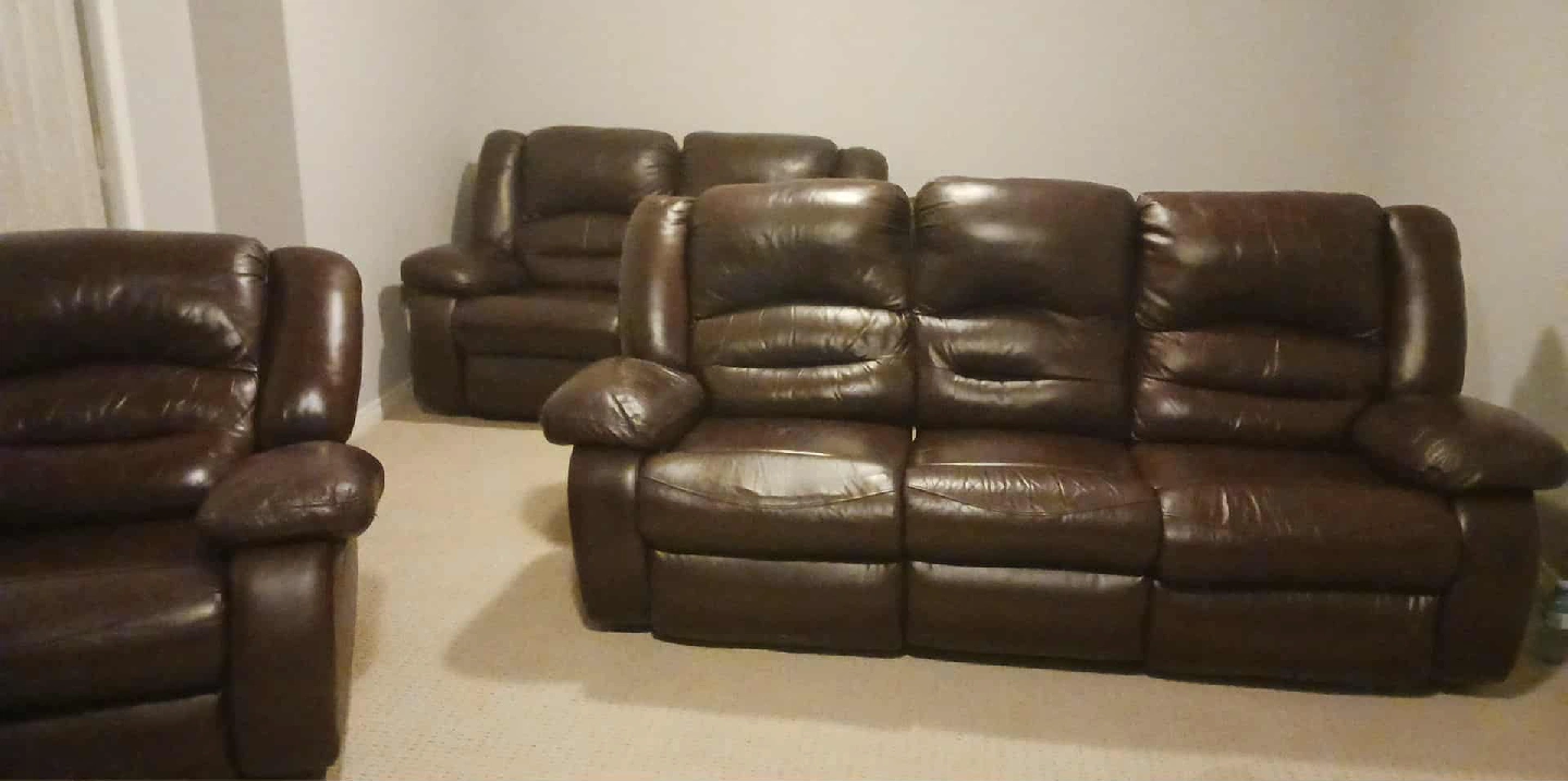Selling a comfy brown leather sofa and matching chair set! These are reclining, perfect for a cozy night in. They have some signs of wear, but still have lots of life left. Come take a look! Only available for pick up.