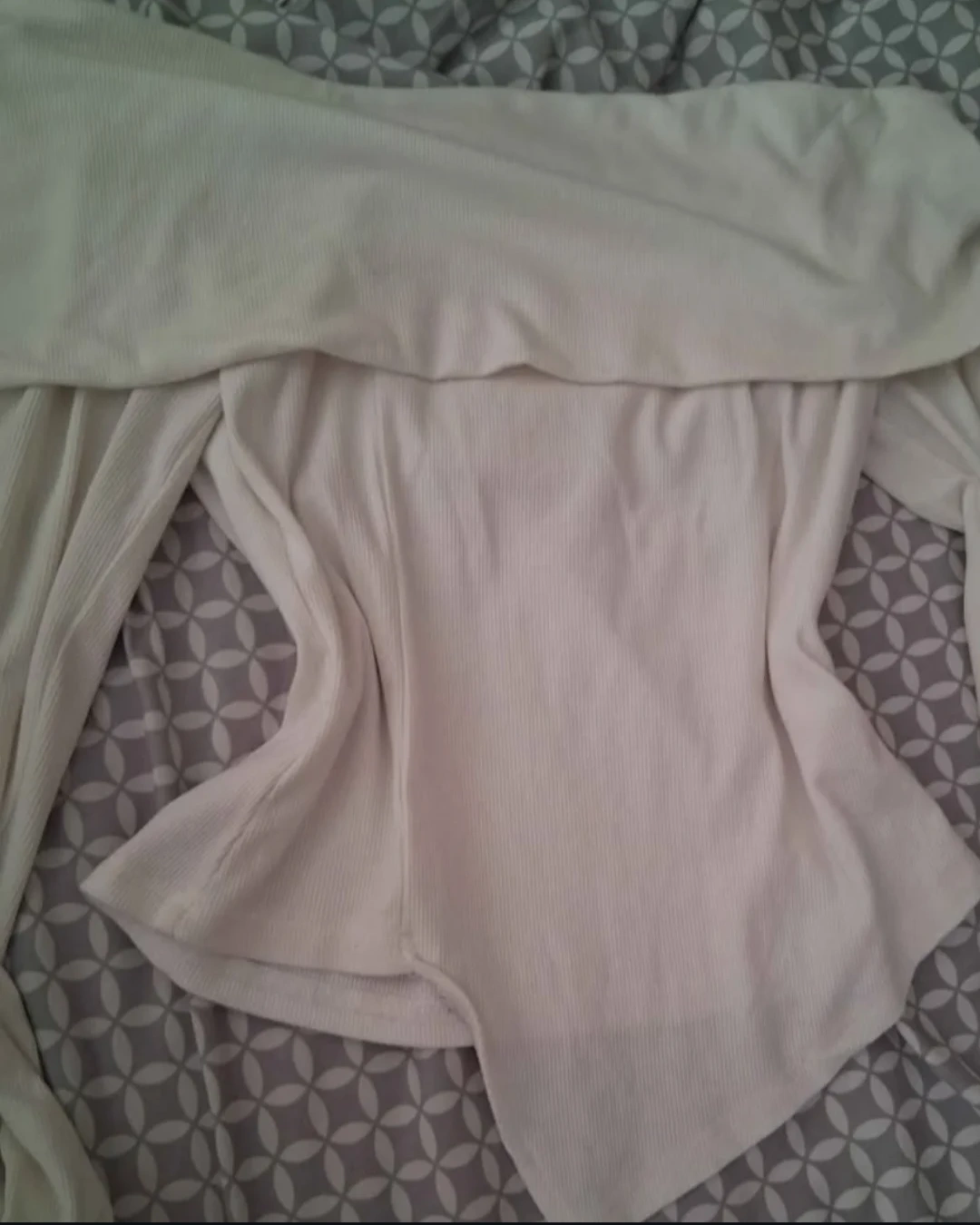 15Selling a cute white, off-the-shoulder top! It's in great condition and perfect for a casual or dressy look. The material is soft and comfortable, making it a great addition to any wardrobe
