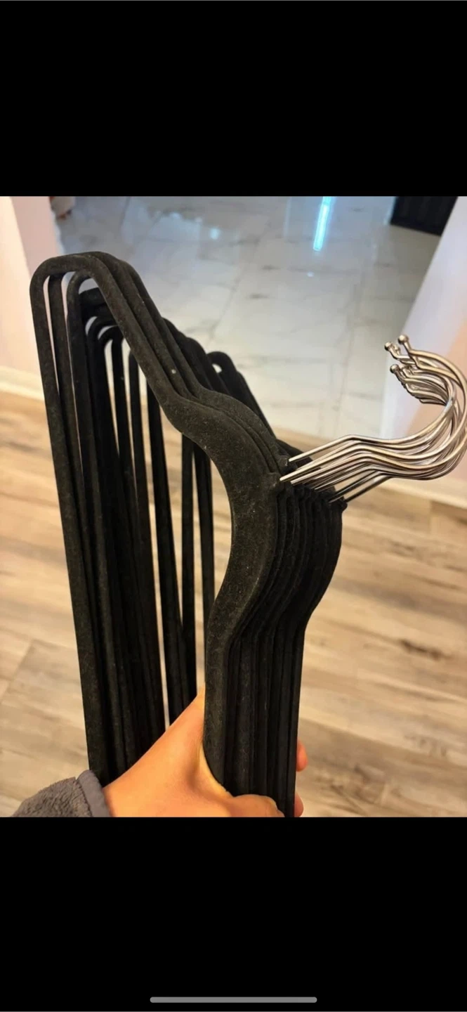 34825 Pieces Luxury Velvet Hangers Comes with 25 Pieces of Luxury Velvet Hangers that make your closet more beautiful and organized These are thin hangers that can fit more clothes in your closet because they are not bulky and big like the normal plastic or wooden hangers. Look more professional and save space with slim velvet premium hangers Get your clothes organized with 25 pieces of luxury velvet hangers, ultra-thin lightweight black and white Velvet hangers. Add a touch of luxury to your closet at an extremely affordable price. The strong metal hanging hook is given a polished chrome finish to complement any closet decor. With a complete set of 83 hangers you will never run short of hangers, giving your closet a luxurious unique look. The contoured shoulders keep clothes shapes while the additional notches help to keep accessories in place. * Velvet Surface to Prevent Slippage * Rotating Hook * Notches Shoulders for Blouses, tank tops and dresses Velvet Hangers feature a soft, non-slip, velvet material that keeps your clothes securely in place. No more worrying about shirts, sweaters, or coats sliding off and creating a messy closet. These hangers not only enhance your organization but also protect your garments from unwanted creases and stretching. Say goodbye to wardrobe mishaps and hello to a beautifully organised closet with these reliable hangers. The velvet material creates a non-slip surface perfect for suits, jackets, pants, shirts, and more. Velvet surface prevents your clothes from slipping. No Slipping Velvet hangers feature a non-slip velvet material that holds clothes in place without falling or sagging. The contoured shoulders keep clothes shapes while the additional notches help to keep accessories in place. Space Saver The hanger's slim and sleek design allows you to maximize space in your closet while keeping your clothes secure while being stored. Comes with 25 Pieces of Luxury Velvet Hangers. Can be picked up or delivered Cheap - message me