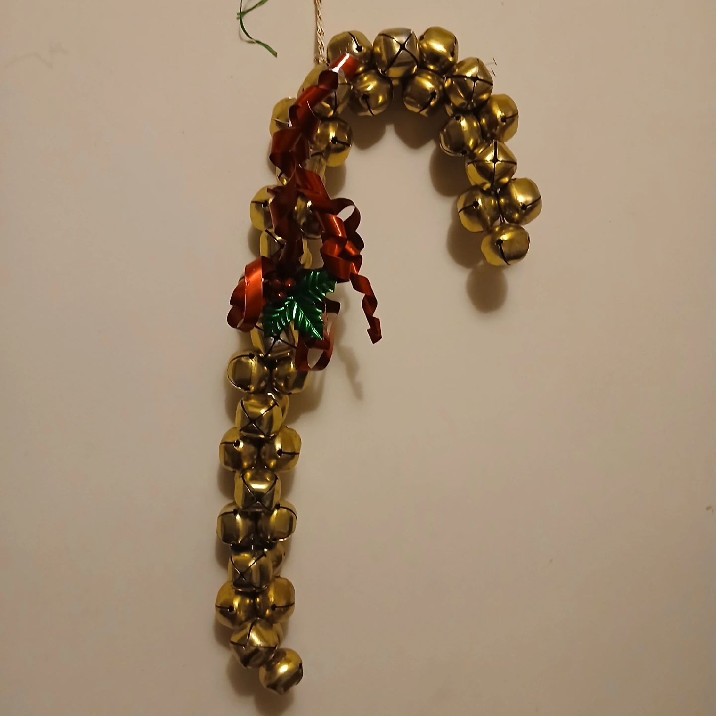 Add a festive touch to your holiday decor with this charming candy cane made of golden bells! It's adorned with a red and green ribbon, ready to spread Christmas cheer in your home