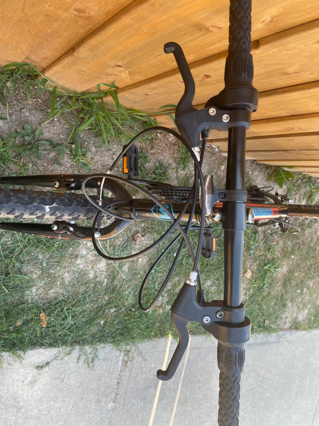 Selling in new condition a Movaelo Algonquin mountain bike with 26-inch wheels. It features a black frame with red and blue accents. Perfect for trails or getting around town!