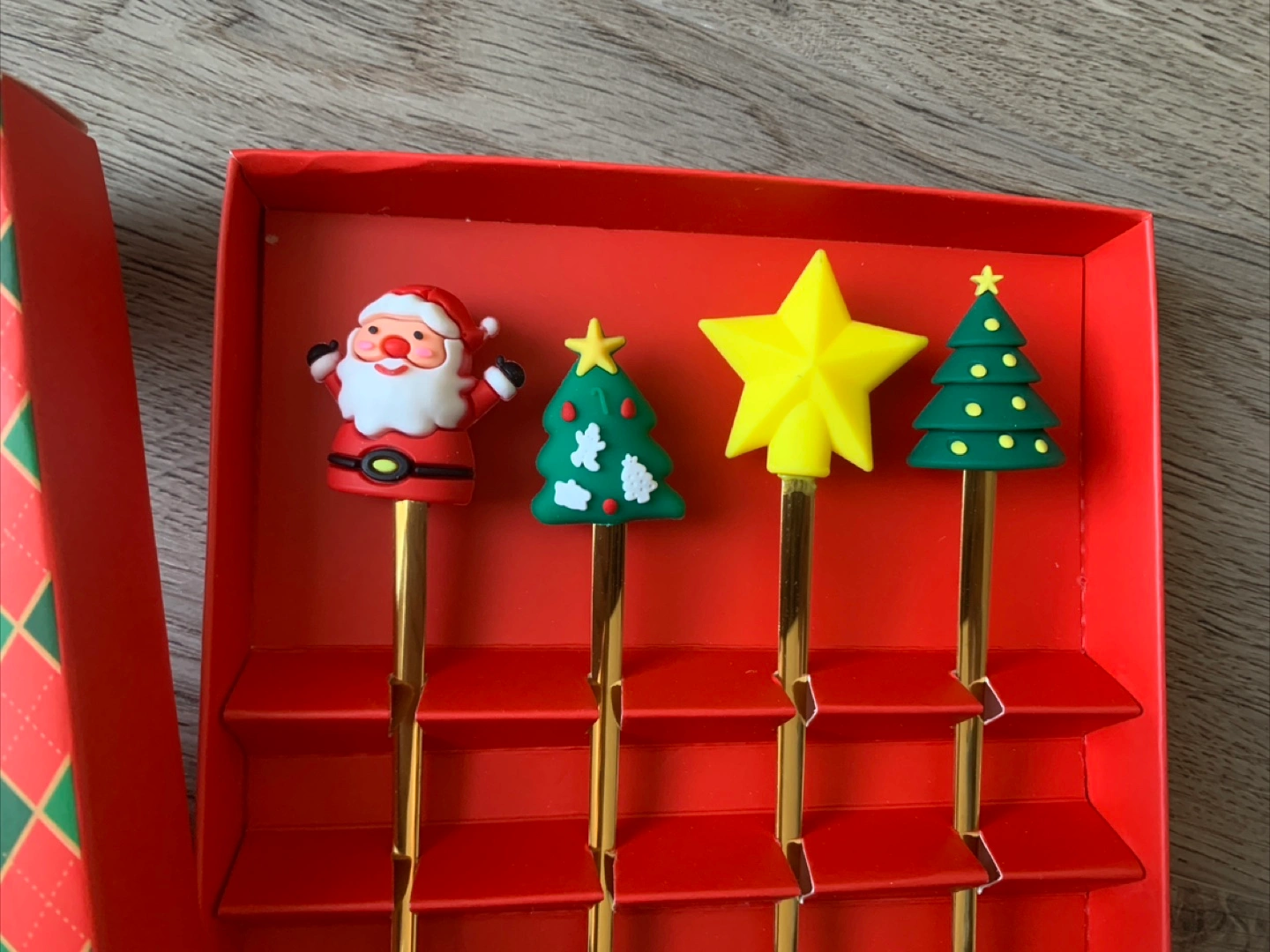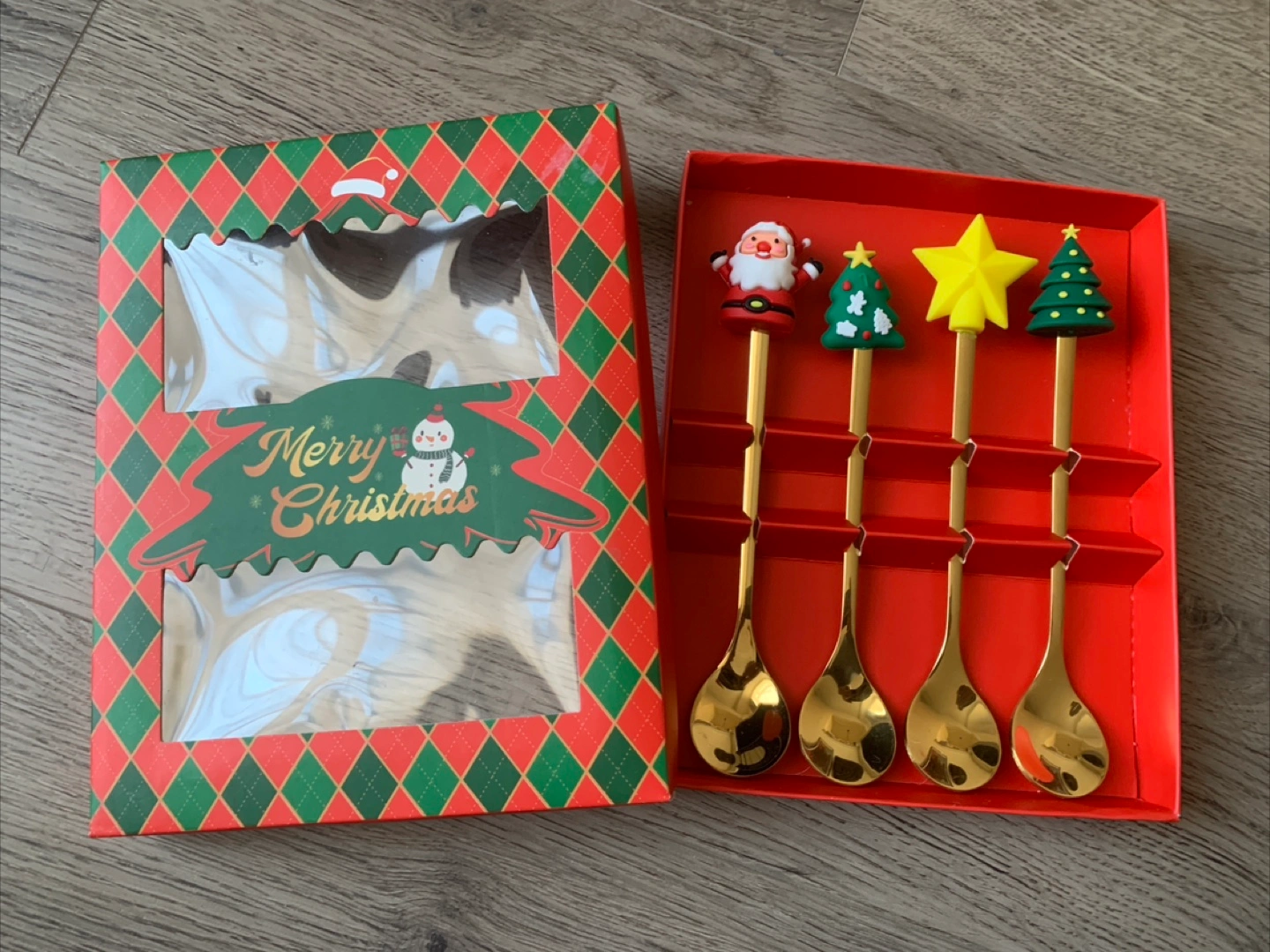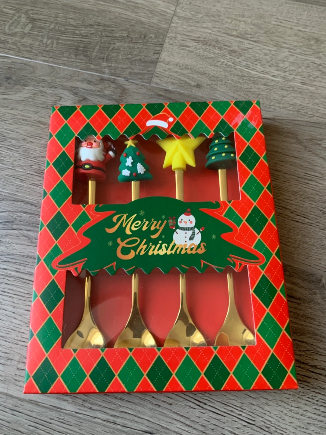 Here's a super cute set of Christmas-themed spoons, still new in the box! Perfect for adding a festive touch to your holiday treats and drinks. The set includes four spoons with adorable toppers: Santa, a Christmas tree, and a star. The box is included, making it a great gift!
