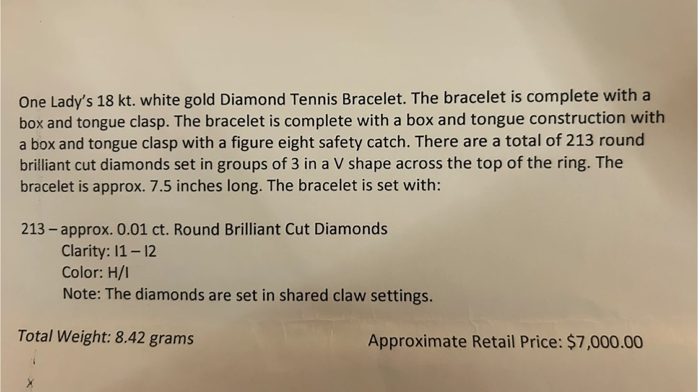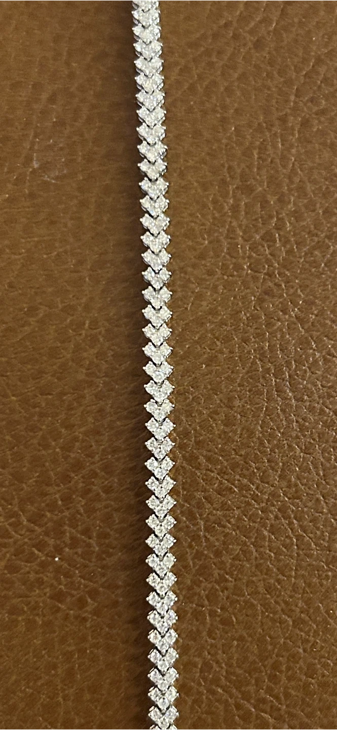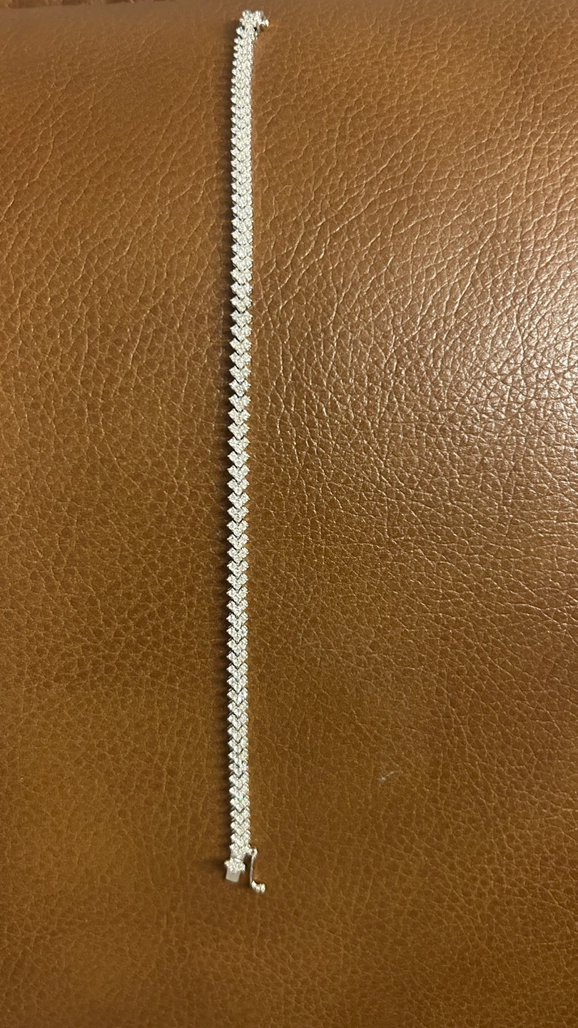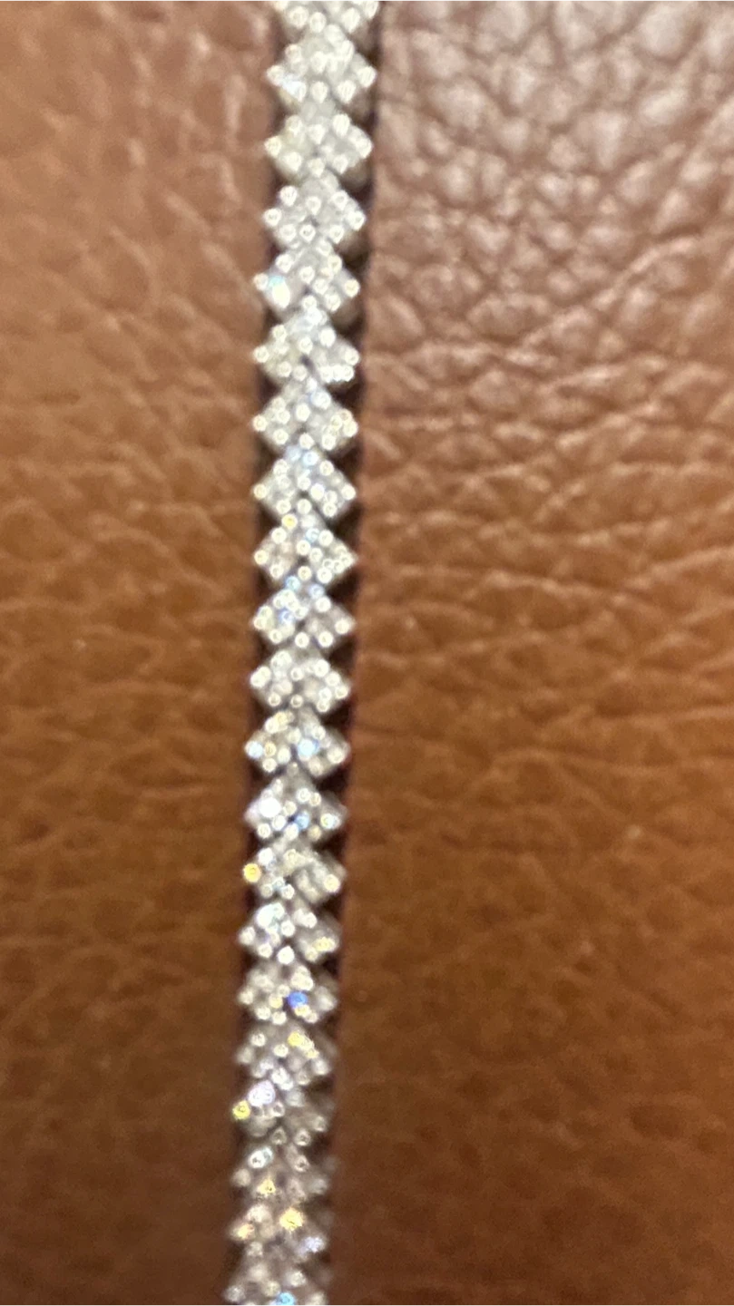 Selling a beautiful lady's 18kt white gold diamond tennis bracelet. It's complete with a box and tongue clasp, plus a figure eight safety catch. The bracelet features a total of 213 round brilliant cut diamonds set in groups of 3 in a V shape across the top. It's approximately 7.5 inches long, with the diamonds set in shared claw settings. The total weight is 8.42 grams. Approximate retail price is $7,000.00