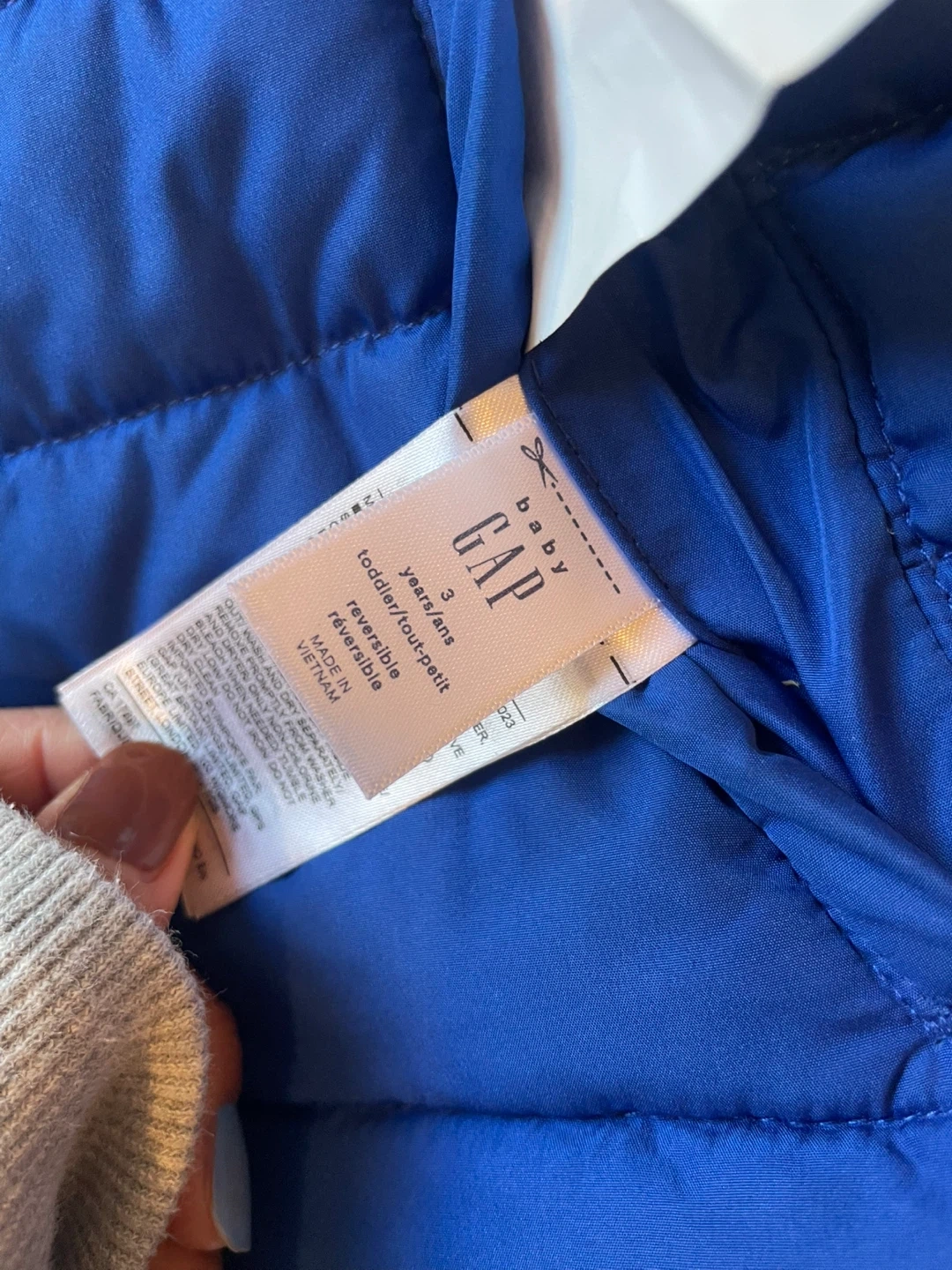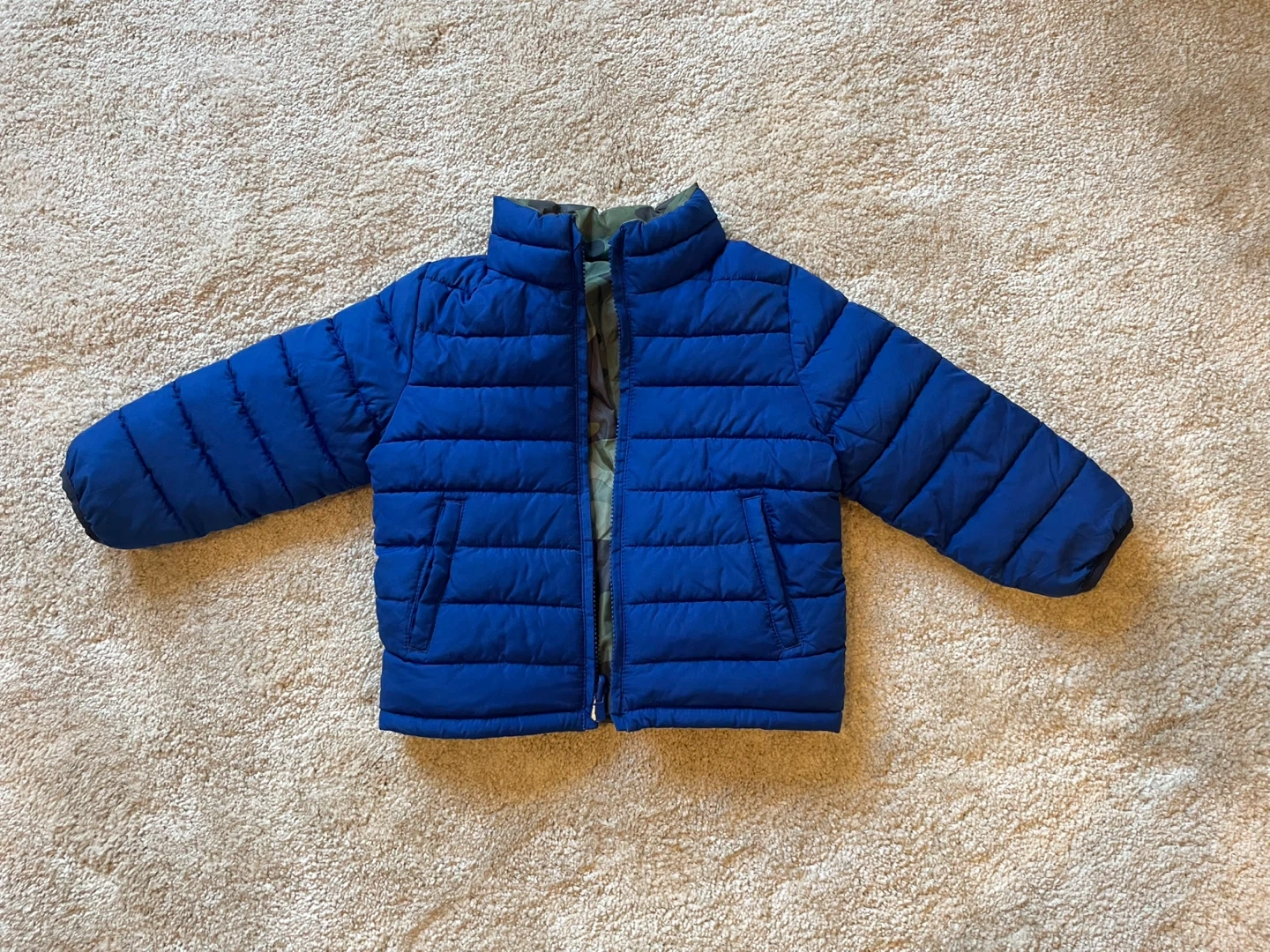 18This is a GAP baby reversible puffer jacket in size 3 years. It's reversible, with one side being a camo pattern and the other a blue. The jacket is in great condition , only few times used.
