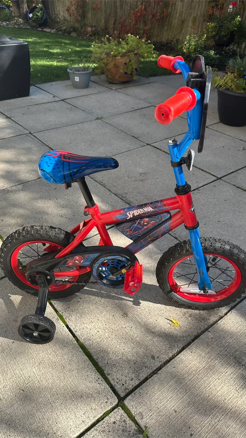 Selling a super cool Spider-Man themed kids' bike! It's red and blue, and perfect for a young fan of the web-slinger. It has training wheels to help your little one learn to ride safely and with confidence