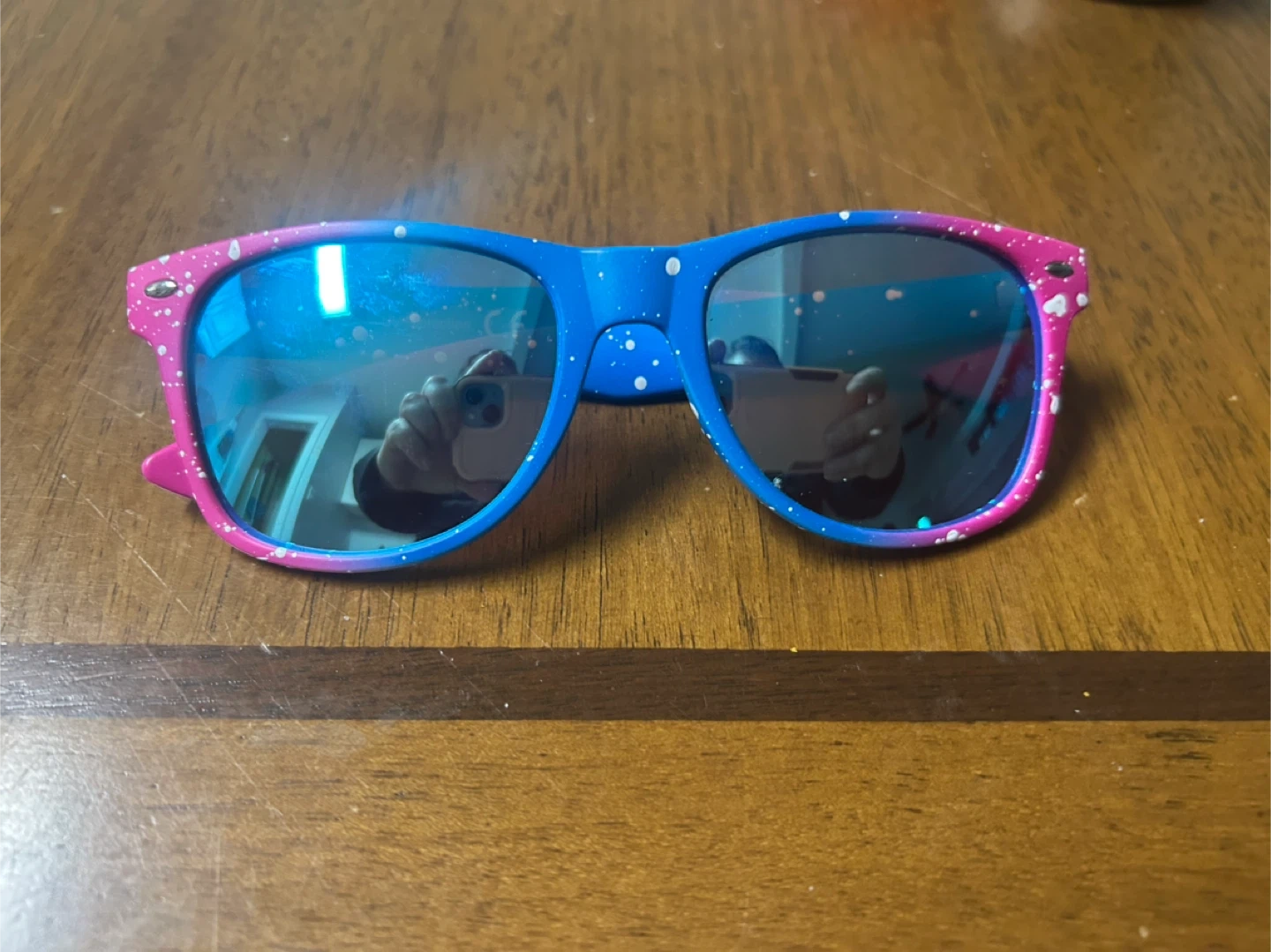 60Cool pair of sunglasses with a blue and pink frame! They have a fun, speckled design, perfect for adding a pop of colour to your look