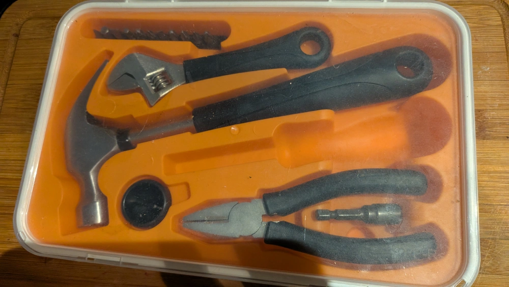 Selling a handy tool set that comes in its own case! It includes a hammer, pliers, wrench, and a few other useful tools. Perfect for small jobs around the house or to keep in the car for emergencies