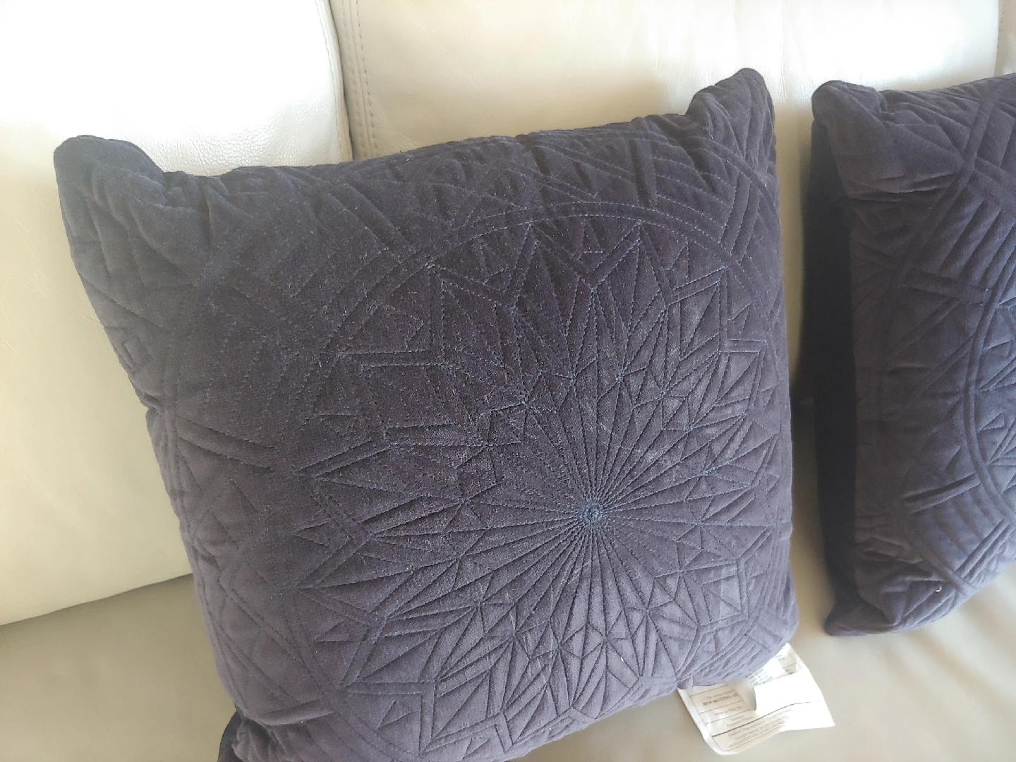 784Selling 2 Hometrends decorative cushions. It is 18 inches by 18 inches (46 cm x 46 cm). brand new never used. Navy blue and velvet front. both $10