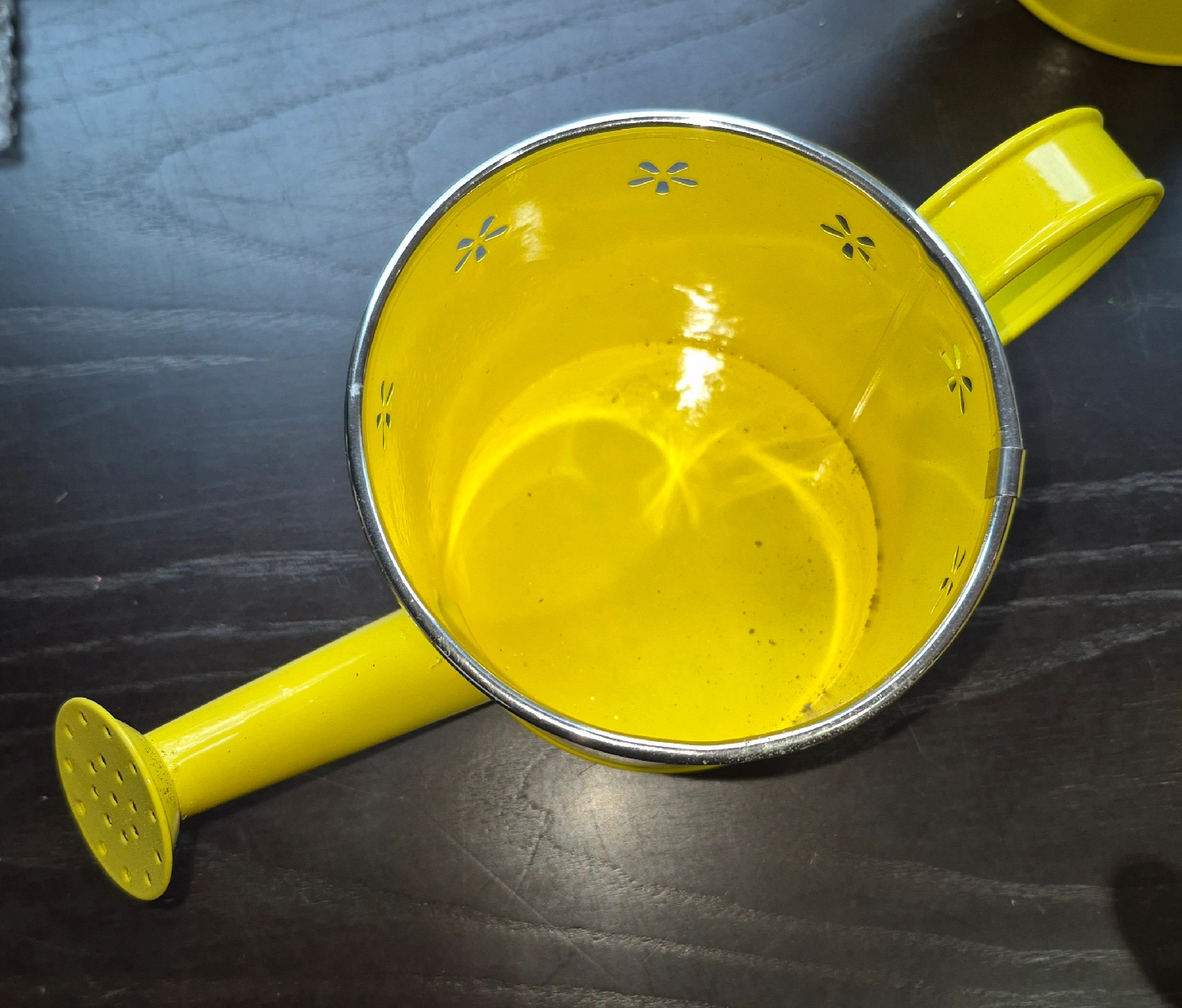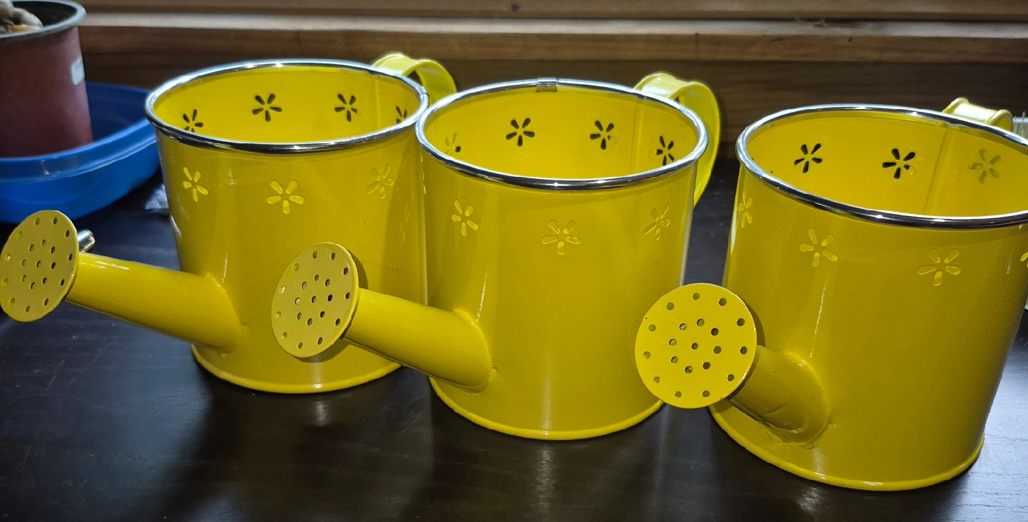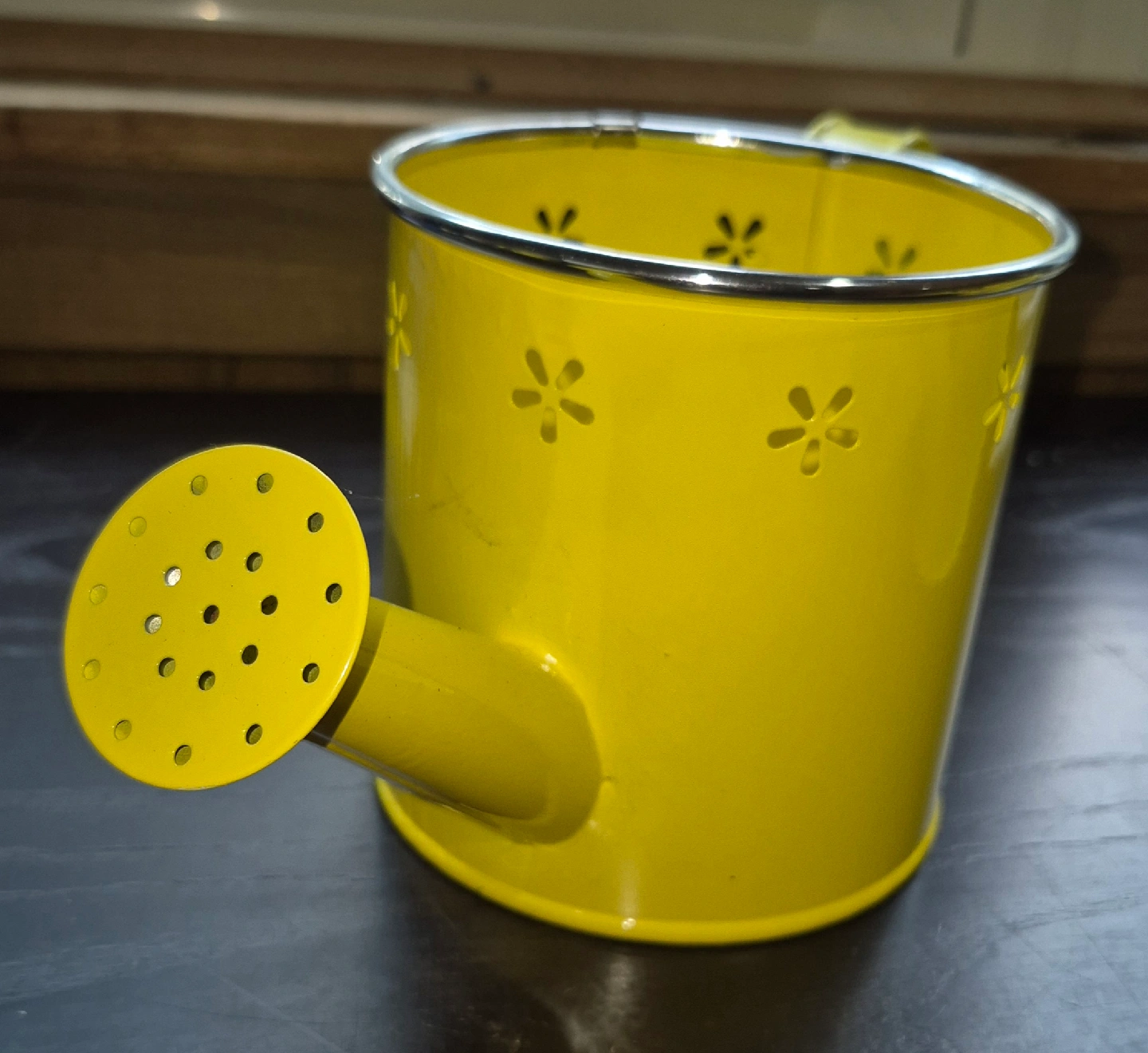 62Selling 3 cute yellow metal watering can! It's in great shape and would be perfect for indoor or outdoor plants. The design features little flower cutouts around the can.