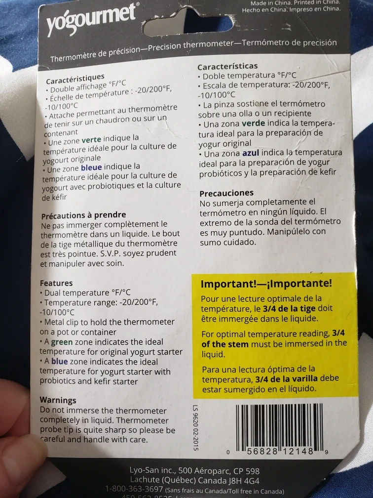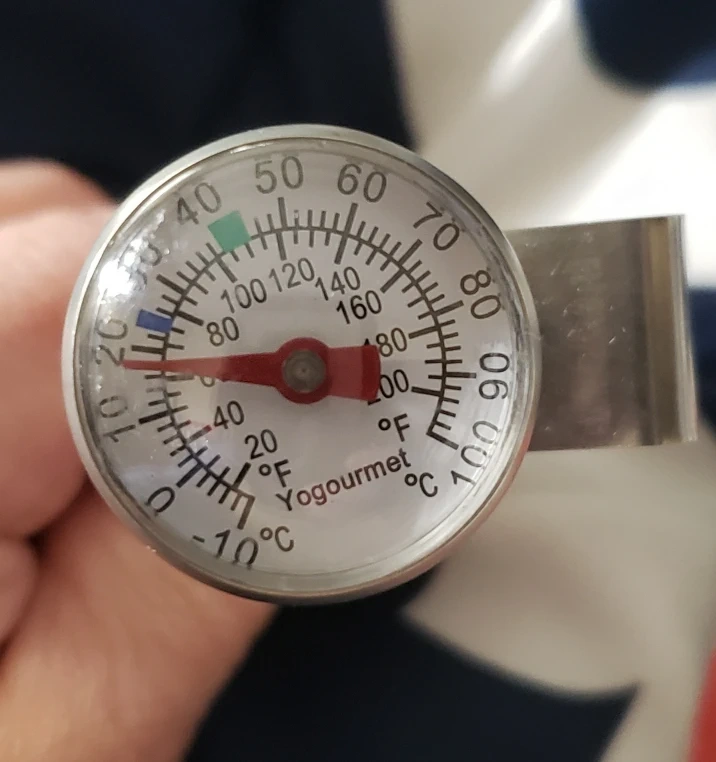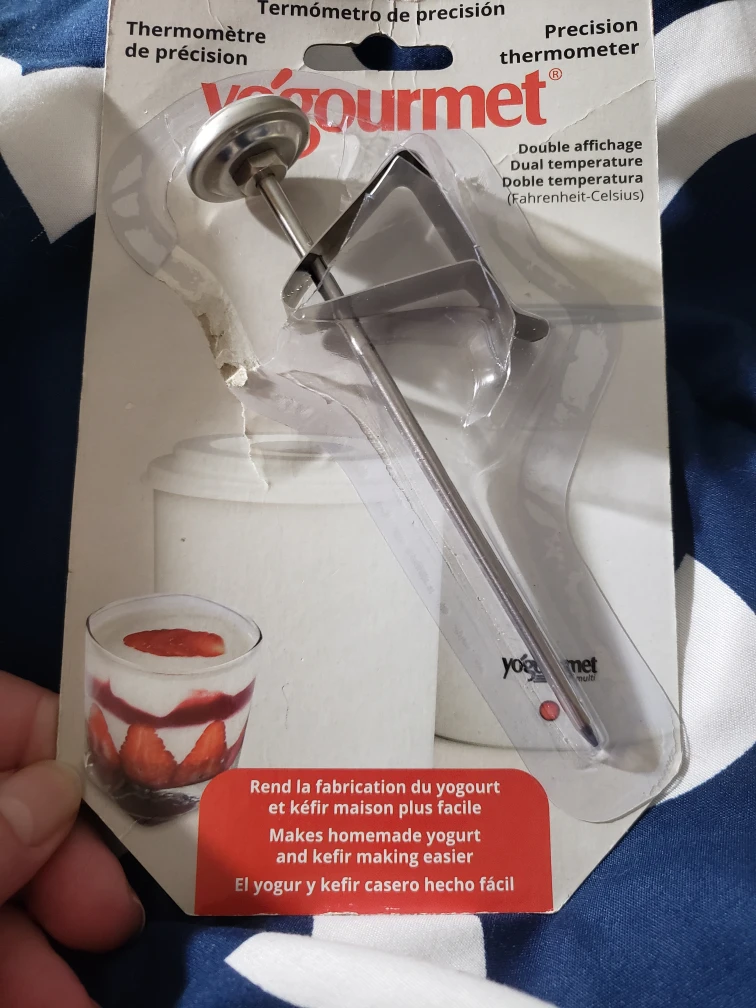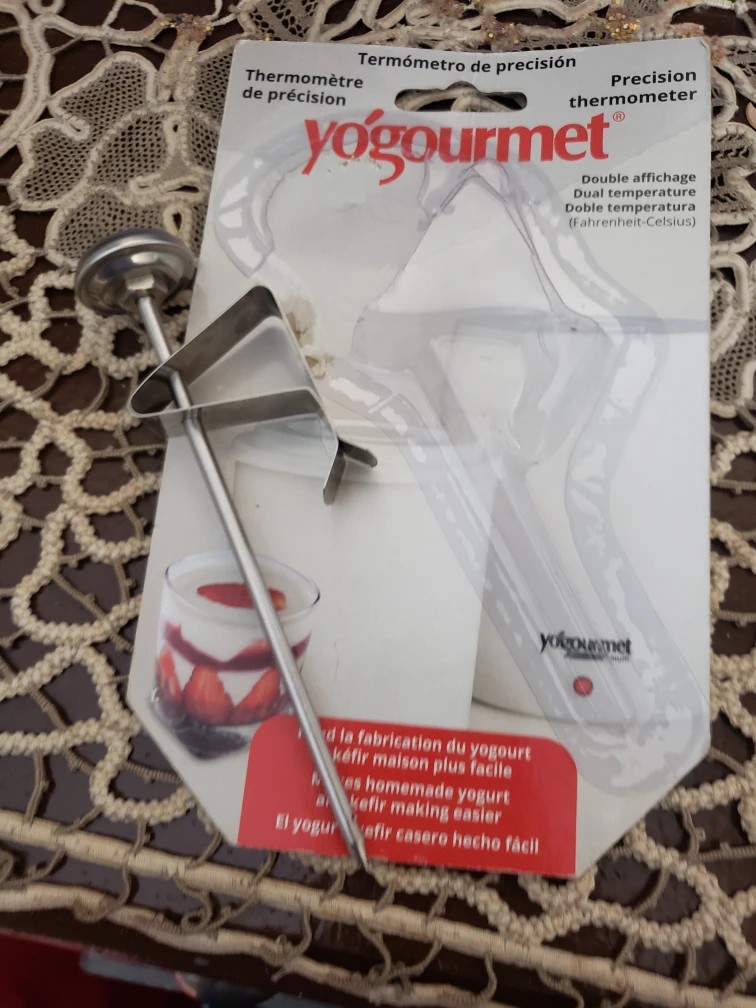 Selling a Yogourmet precision thermometer, still in its original packaging! It features dual temperature display in both Fahrenheit and Celsius, ranging from -20 to 200°F / -10 to 100°C. The metal clip allows you to easily attach it to a pot or container. A green zone indicates the ideal temperature for original yogurt starter, and a blue zone indicates the ideal temperature for yogurt starter with probiotics and kefir starter