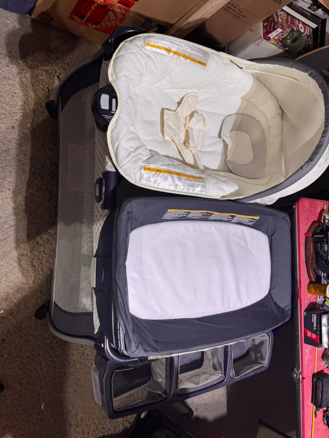 Two levels for baby, a change table, a bassinet and a side compartment for diapers and wipes.