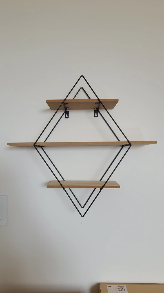 Diamond-shaped wall shelf with three wooden shelves and a black metal frame. It's a stylish piece to display your favourite items! New item.