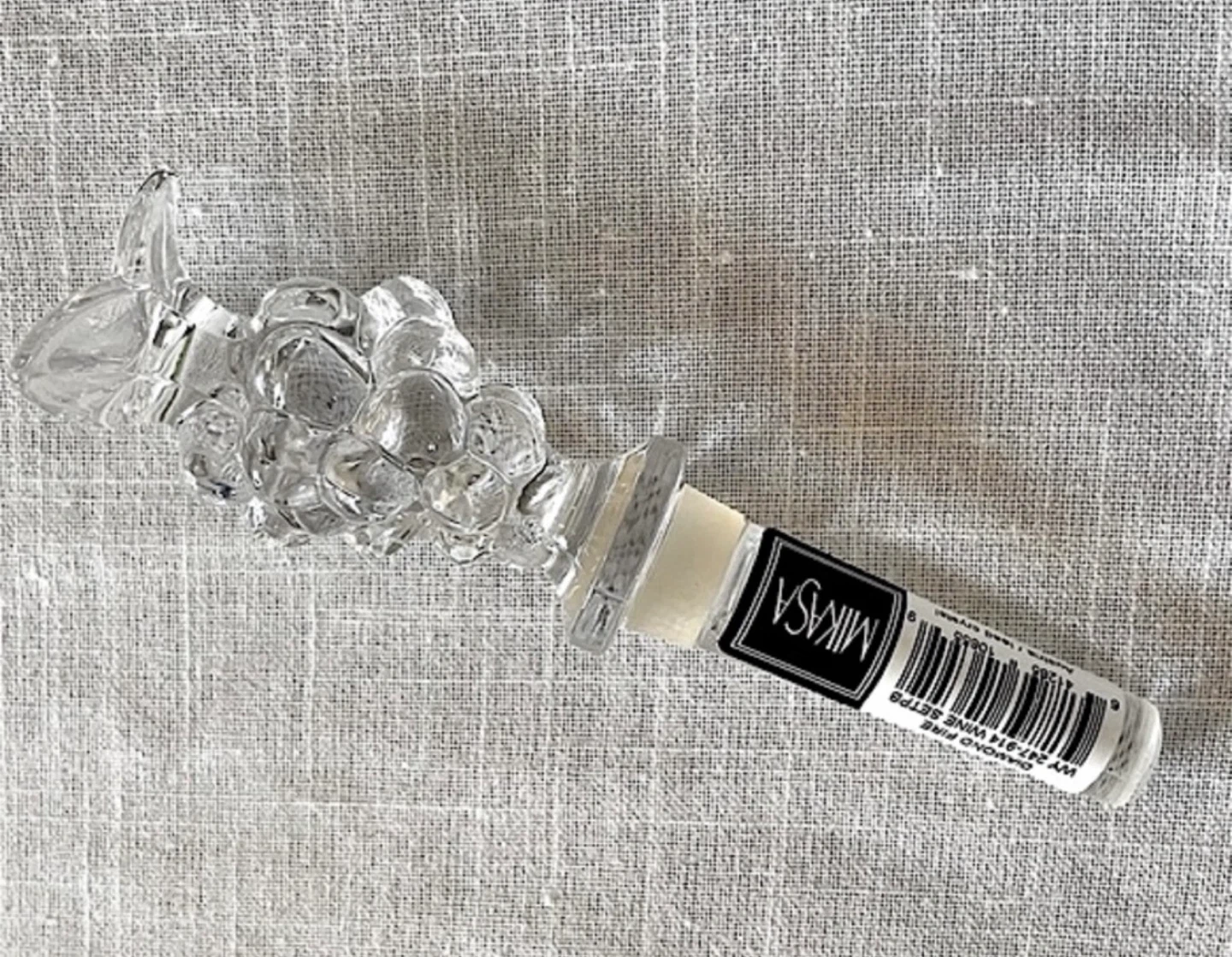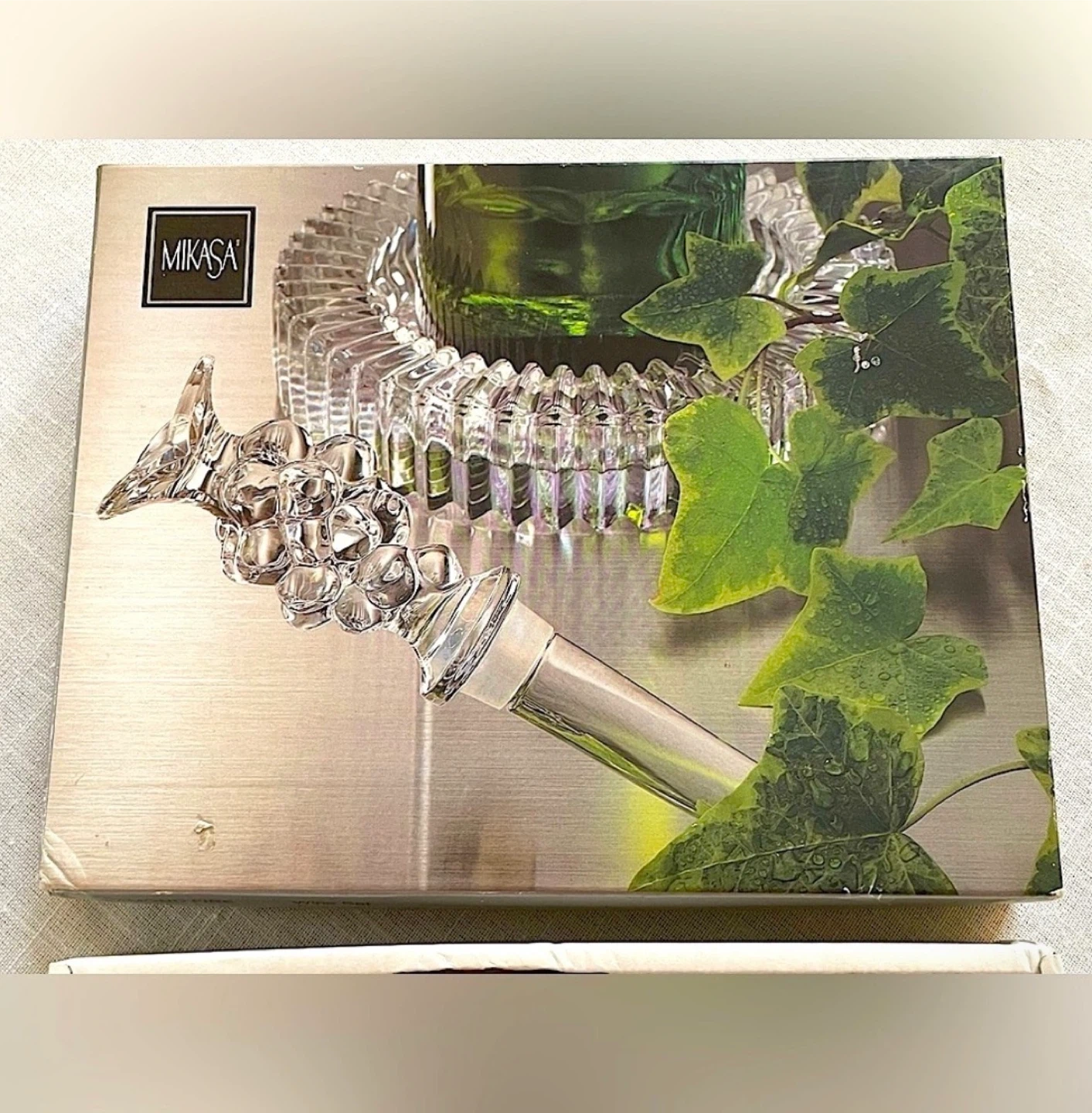 Includes a gorgeous coaster and a grape wine stopper. Still in the box, neither have ever been used. No flaws to note. High quality.