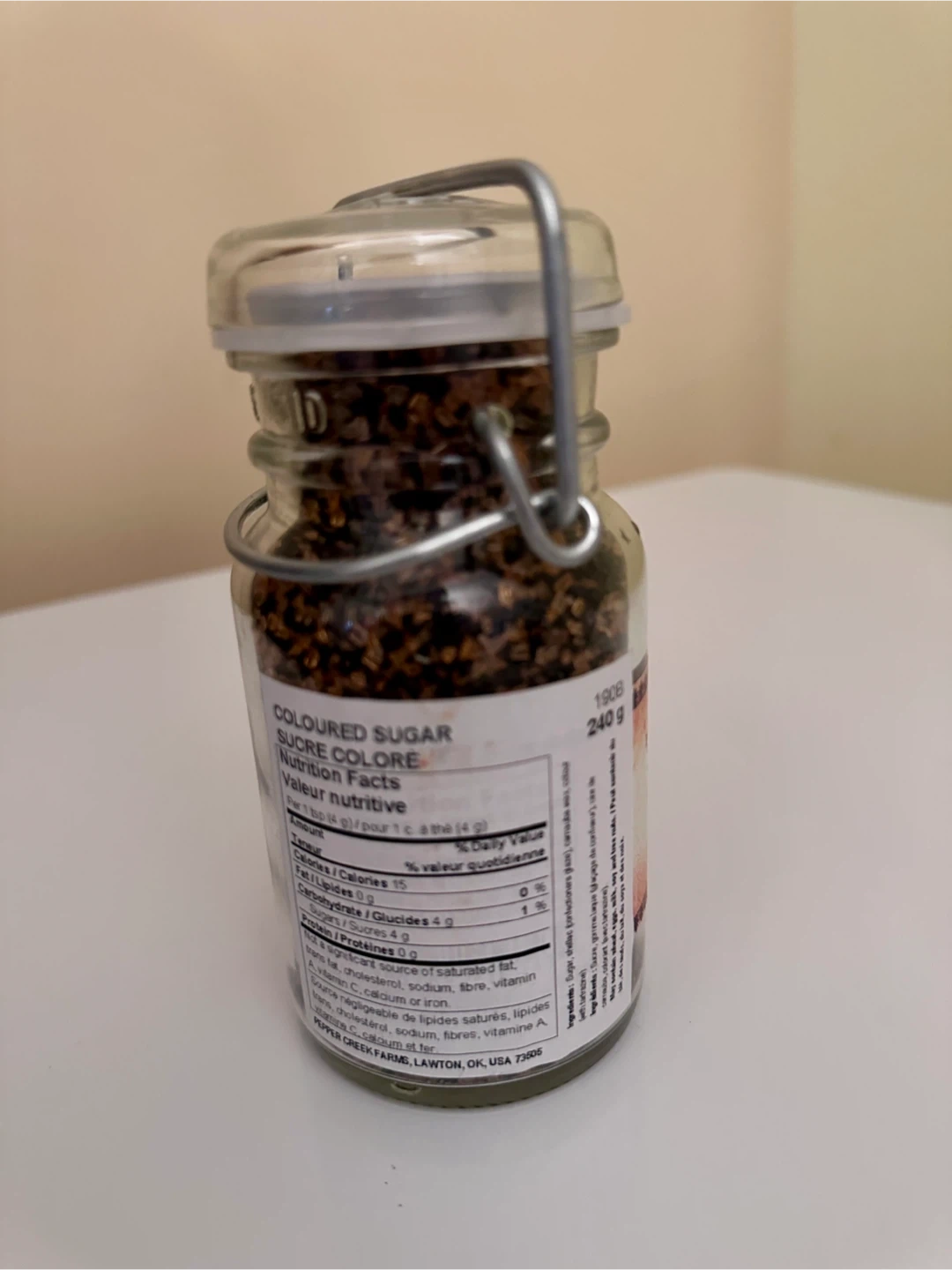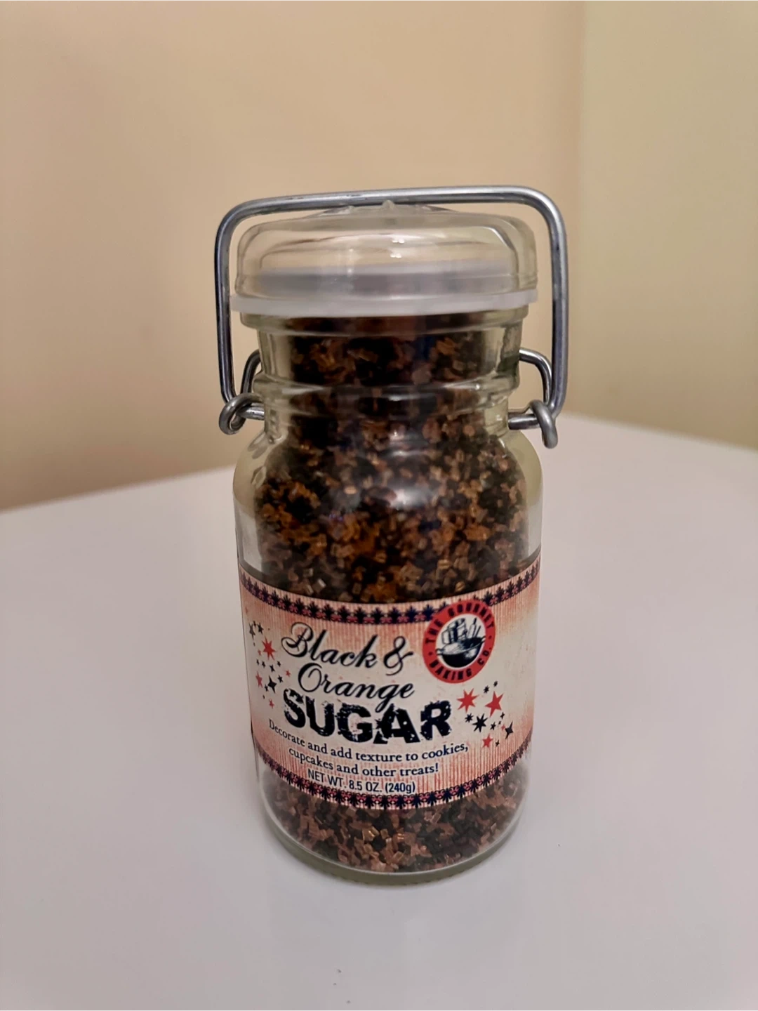 Here's a jar of Pepper Creek Farms Black & Orange Sugar! It's perfect for decorating and adding texture to cookies, cupcakes, and other treats. The net weight is 8.5 oz (240g).