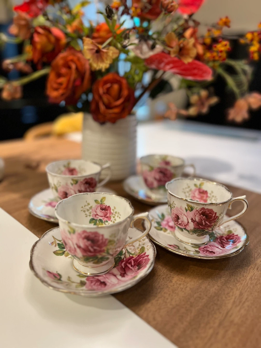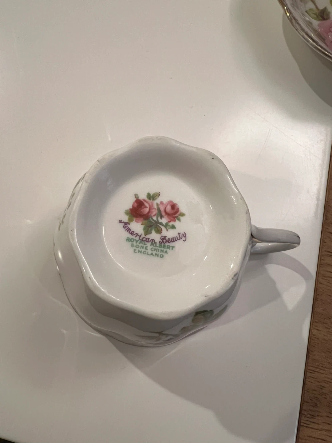 10Selling a beautiful Royal Albert teacup and saucer set in the American Beauty pattern! The set features a delicate floral design with pink roses. Perfect for tea time or as a lovely addition to your collection. 1 set for $15, get all 4 sets for $50