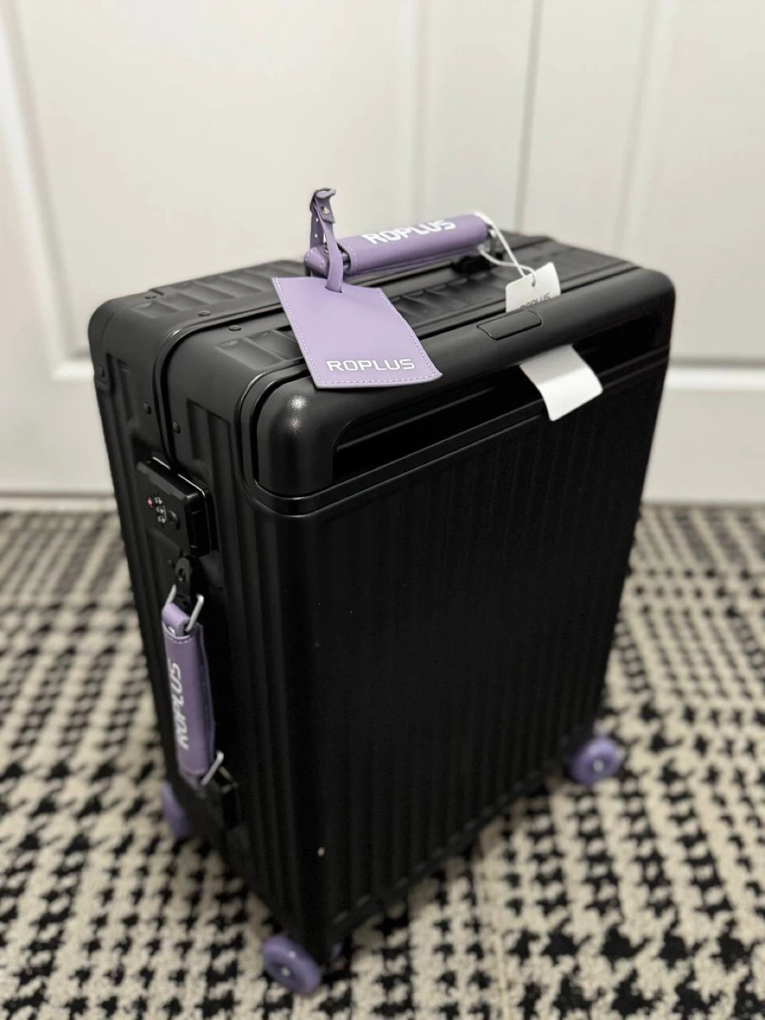 Stylish black version of the premium ROPLUS aluminium-frame suitcase with smooth purple jelly wheels 💜