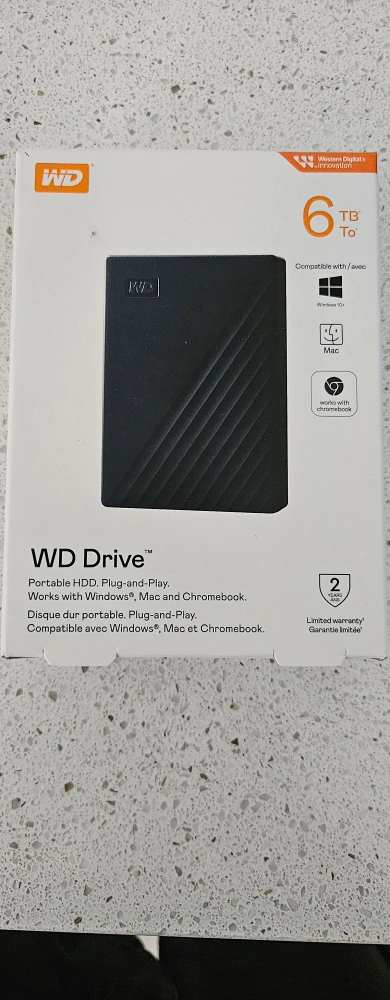 121WD Drive 6TB portable external hard drive! It's a portable HDD that's plug-and-play, and it works with Windows, Mac, and Chromebook. The box includes a limited 2-year warranty BRAND NEW - 200$ REGULAR PRICE 255$