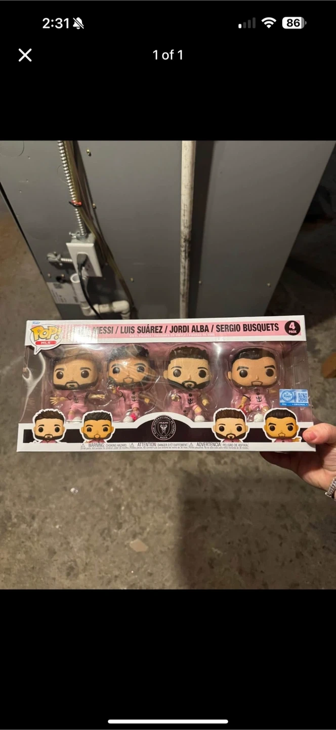 Selling a Funko Pop! 4-pack featuring Messi, Luis Suárez, Jordi Alba, and Sergio Busquets in their Inter Miami kits