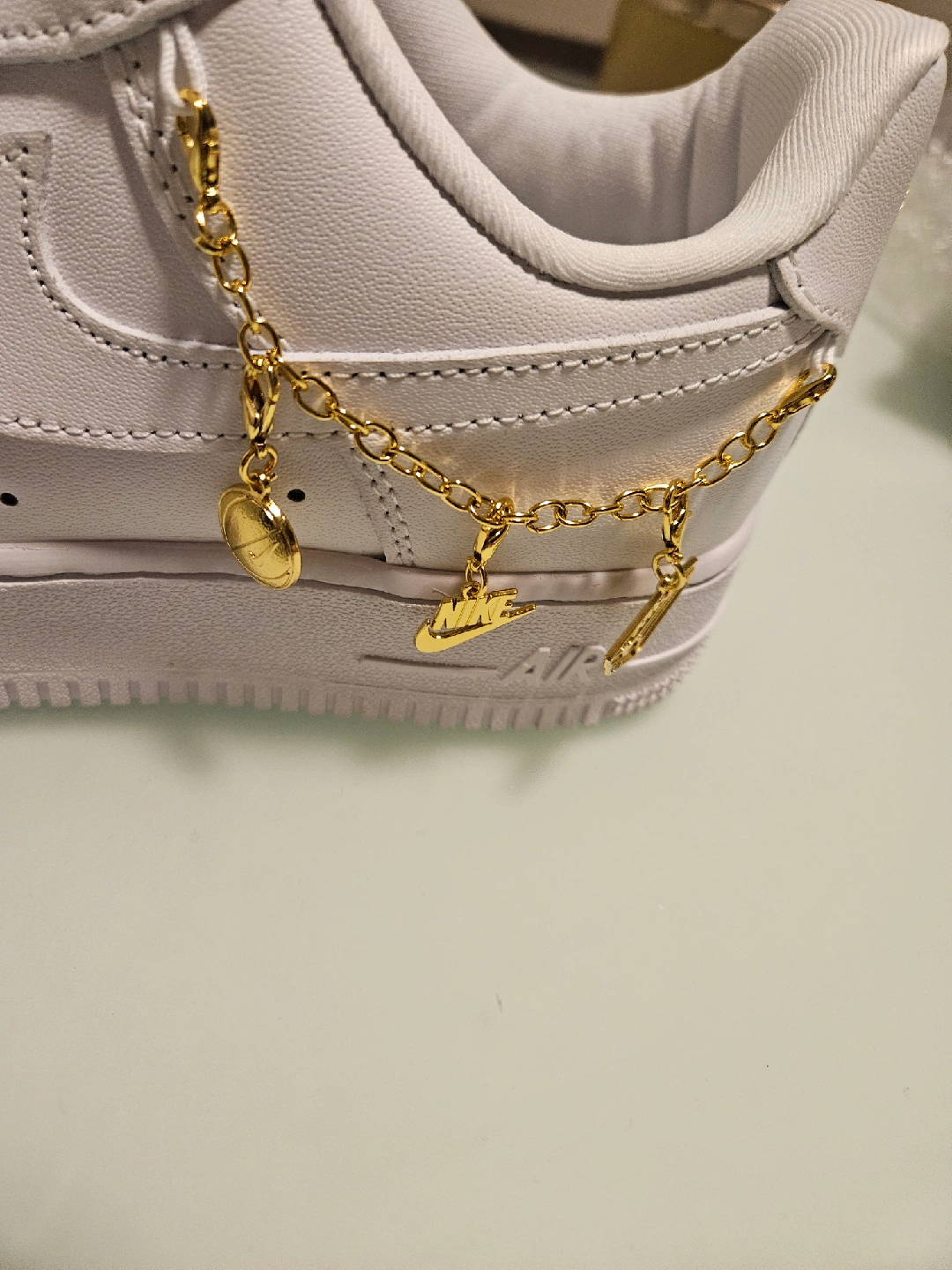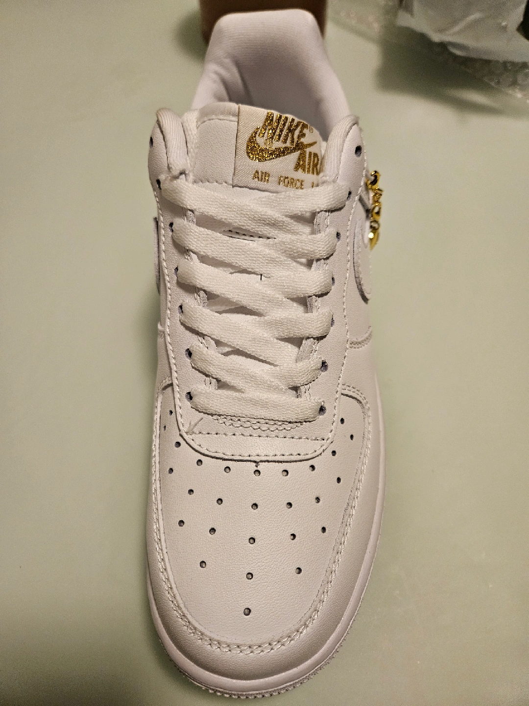 Brand new never worn, pair of Nike Air Force 1 '07 Lucly Charms in white. These are a women's size US 8, UK 5.5, EUR 39, CM 25. They also have gold charms attached!